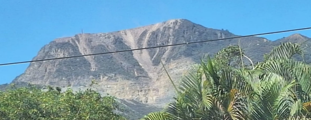 Por la carretera federal 98, que recorre el estado de Colima al conectar Minatitlán con el puerto de Manzanillo —el más importante de México—, llegamos a un punto que sirve de mirador. Desde una brecha sin cobertura telefónica se alcanza a ver la destrucción causada por Peña Colorada: los enormes tajos en el deforestado Cerro Los Juanes crean una gran mancha de color gris y ocre; en la cima, ahora árida, hay un complejo de oficinas con maquinaria pesada que se utiliza en la mina a cielo abierto.