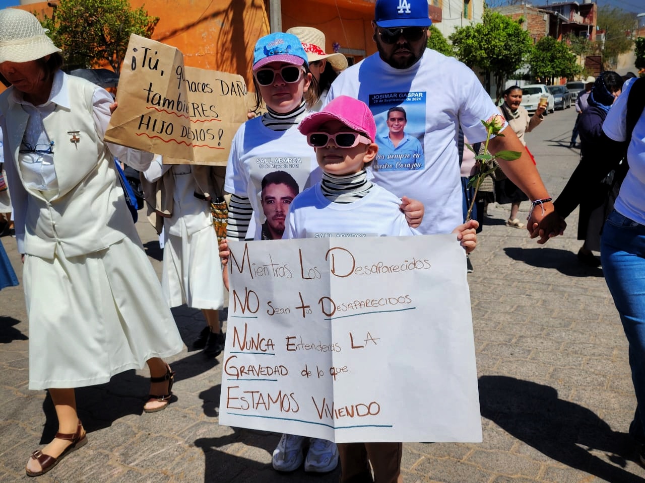 A la “Jornada de Oración y Consuelo” convocada por el padre Jaime Gustavo Navel Mora, cura principal de Teuchitlán, llegaron las y los integrantes de Familias Unidas por Nuestros Desaparecidos en Jalisco (FUNDEJ), Por amor a Encarnación Jalisco, Madres Buscadoras de Sinaloa y Guerreros Buscadores de Jalisco, quienes marcharon por las calles principales de este municipio para visibilizar a sus seres queridos, pero también para exigir que lo que pasó a kilómetros de la cabecera municipal: “no vuelva a suceder jamás”.