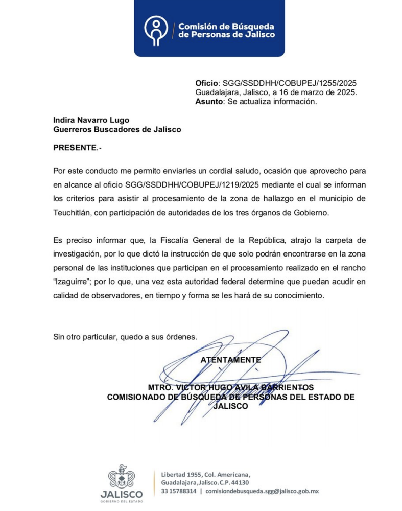 Esto fue confirmado por la Comisión Nacional de Búsqueda de Personas de Jalisco, quien les hizo llegar al colectivo el siguiente documento a Indira Navarro, líder del colectivo: