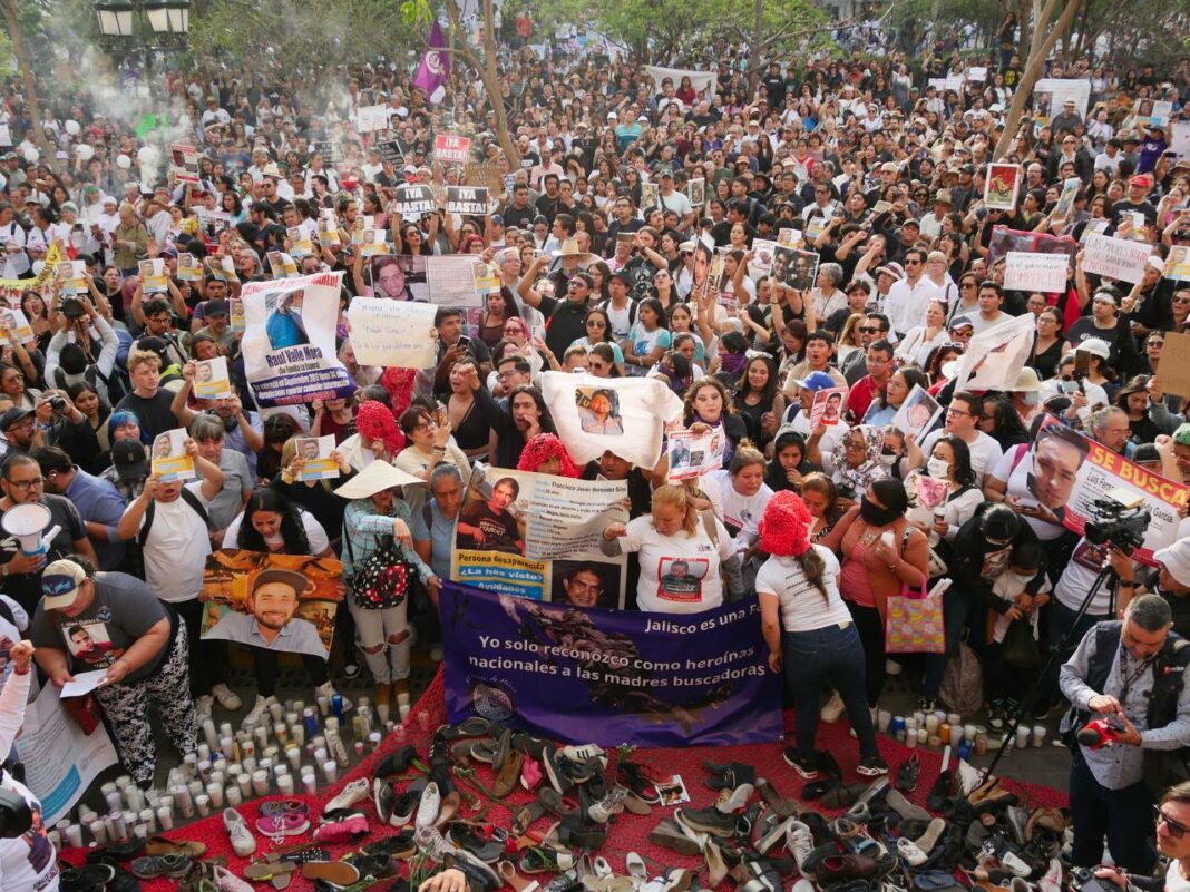 Cientas de pares de zapatos, velas y pancartas con los nombres de los desaparecidos fueron colocados al pie del Palacio de Gobierno para que el gobernador, Pablo Lemus, y su gobierno nunca olviden lo ocurrido.
