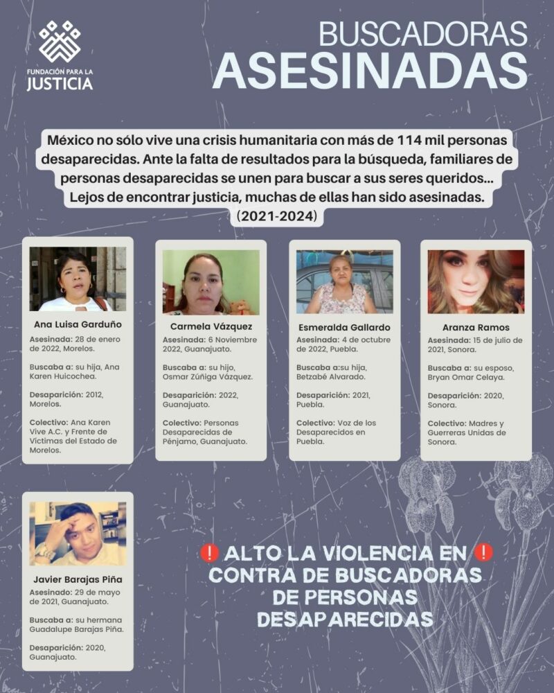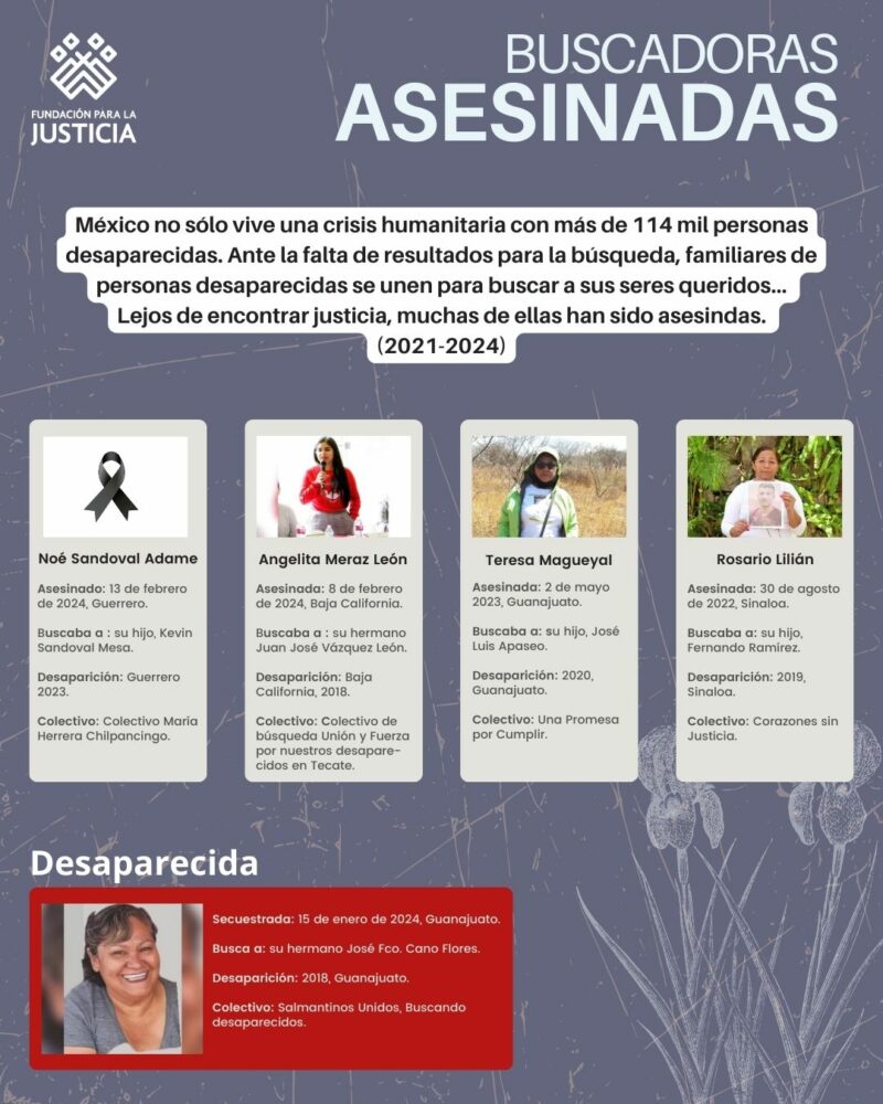 La organización Fundación para la Justicia tiene un registro de 9 asesinatos de familias buscadoras y la desaparición de una madre entre los años 2021 y 2024; a esta dolorosa realidad se le suman los casos de Magdaleno Pérez Santos y Sofía Raygoza Ceballos.