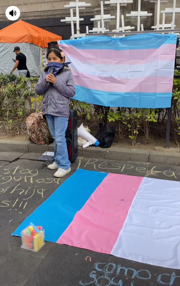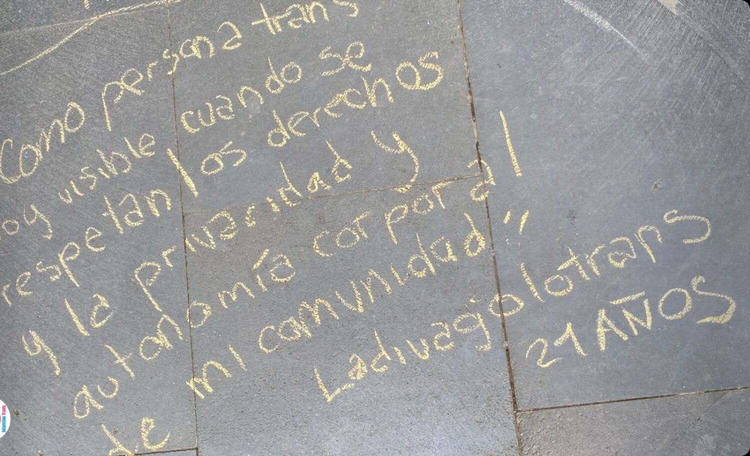 Como este mensaje otros fueron colocados con gises de colores sobre la banqueta que rodea la entrada principal del recinto. La mayoría de estos fueron escritos por infancias y adolescencias trans y no binaries, así como por sus familiares. En ellos narraron sus vivencias y su sentir, pero sobre todo, para exigir el respeto y “reconocimiento pleno de sus derechos en México y en el mundo”.