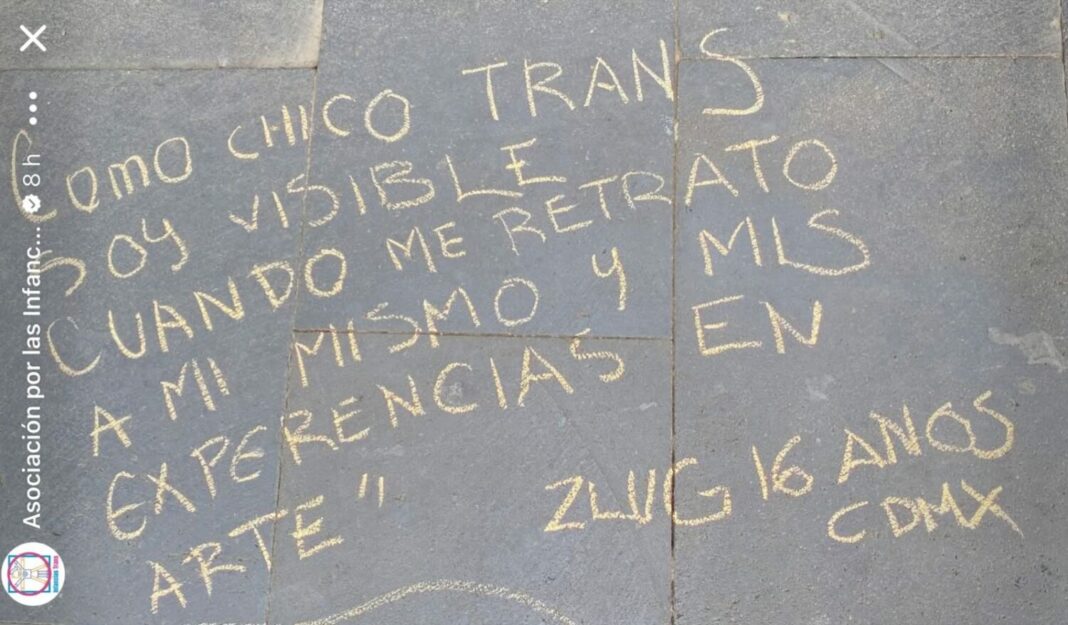 Como este mensaje otros fueron colocados con gises de colores sobre la banqueta que rodea la entrada principal del recinto. La mayoría de estos fueron escritos por infancias y adolescencias trans y no binaries, así como por sus familiares. En ellos narraron sus vivencias y su sentir, pero sobre todo, para exigir el respeto y “reconocimiento pleno de sus derechos en México y en el mundo”.