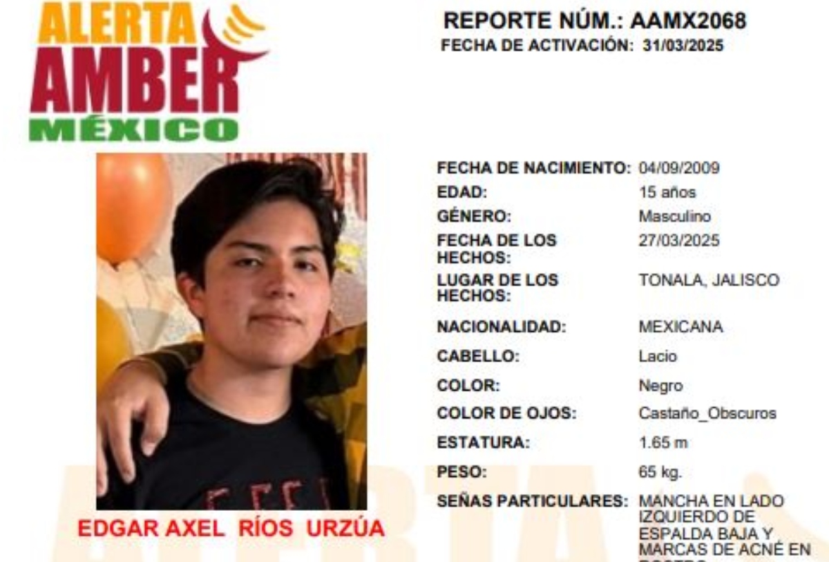 Édgar Axel Rios Urzúa tiene 15 años y es estudiante de la Escuela Politécnica de Guadalajara, perteneciente a la Universidad de Guadalajara (UdeG). El 27 de marzo de 2025 se comunicó con su familia para avisarles que ya iba a casa; lamentablemente, esto no ocurrió.