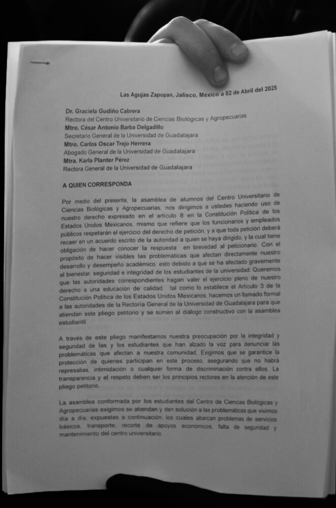 Durante la protesta, alumnas y alumnos entregaron un pliego petitorio dirigido a la rectora general electa, Mtra. Karla Planter Pérez, y otras autoridades universitarias, en el que demandan atención inmediata a las condiciones críticas en las que diariamente asisten a clases. El documento —firmado por la Asamblea Estudiantil del CUCBA— hicieron un llamado a establecer una mesa de trabajo antes del 9 de abril, en la que se atiendan sus demandas con responsabilidad, transparencia y compromiso institucional.