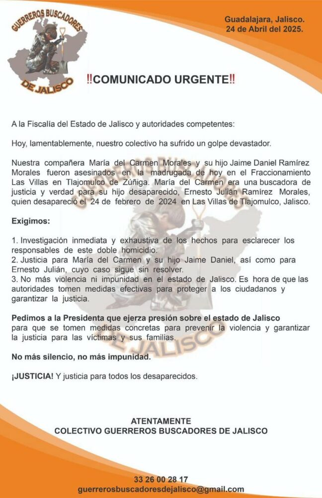 A través de un comunicado de prensa, el colectivo Guerreros Buscadores de Jalisco informó del asesinato de su integrante María del Carmen Morales, quien fue asesinada, el 23 de abril de 2025, junto a su hijo en el Fraccionamiento Las Villas en Tlajomulco de Zúñiga. Ella, buscaba desde 2024, a su hijo Ernesto Julián Ramírez Morales. Este lamentable hecho representa el tercer asesinato de algún familiar de personas desaparecidas en el estado.