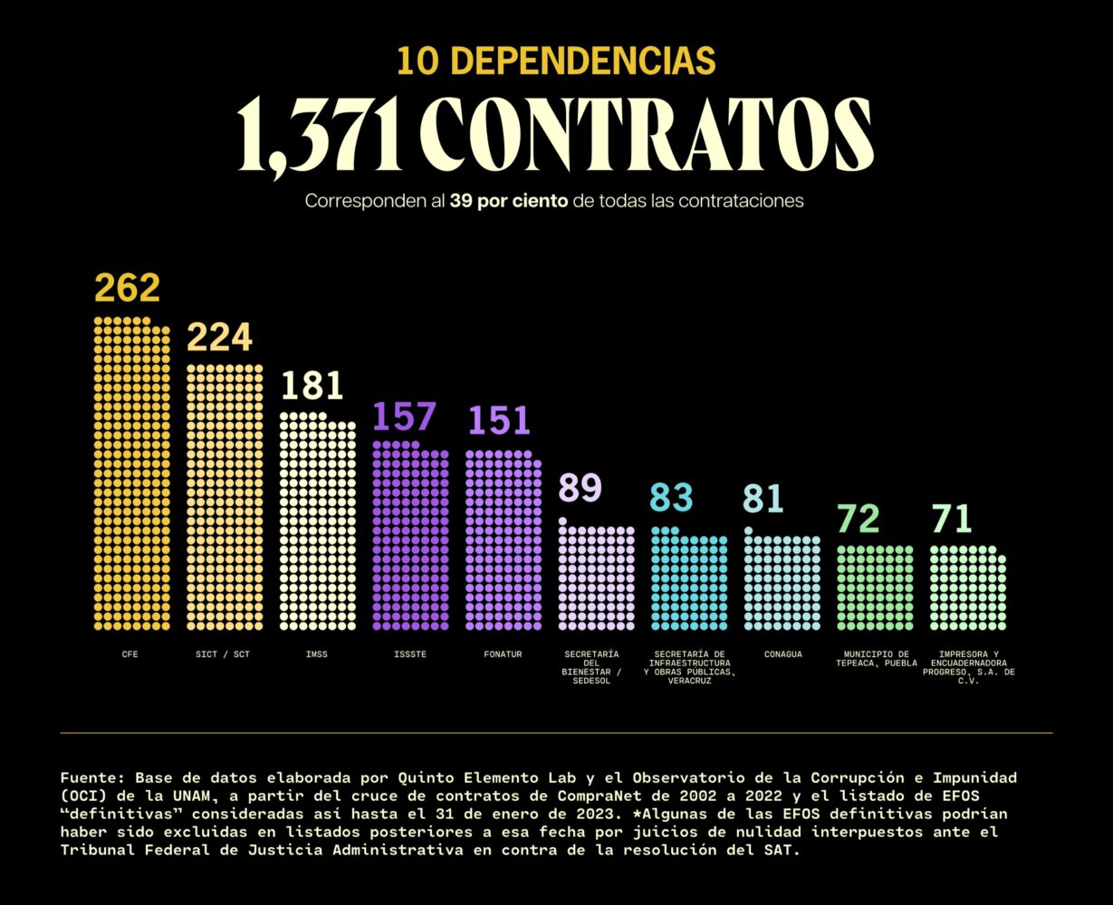 Y tan solo cuatro instituciones —la Comisión Federal de Electricidad (CFE), la Secretaría de Infraestructura, Comunicaciones y Transportes (SICT), el Instituto Mexicano del Seguro Social (IMSS) y el Instituto de Seguridad y Servicios Sociales de los Trabajadores del Estado (ISSSTE)— concentraron una cuarta parte del dinero total otorgado a empresas fantasma.