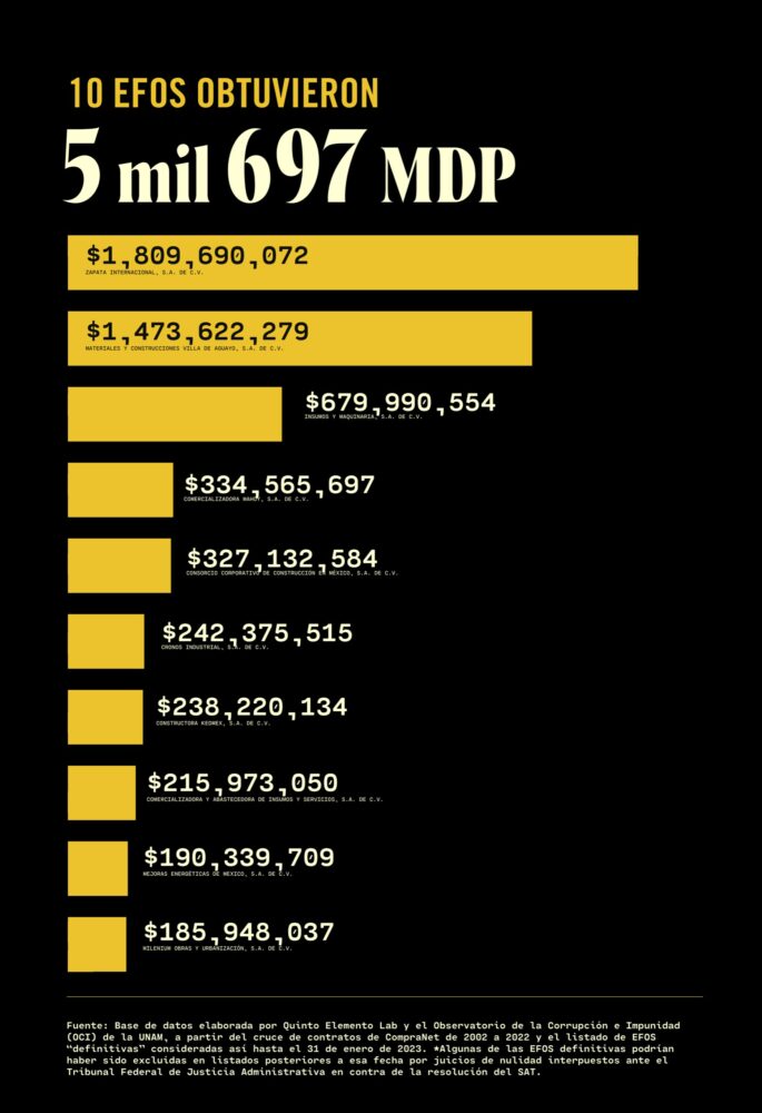 Quinto Elemento Lab, en colaboración con el Observatorio de la Corrupción e Impunidad (OCI) del Instituto de Investigaciones Jurídicas de la Universidad Nacional Autónoma de México (UNAM), realizó este análisis a partir de una base de datos en la que se cruzaron los contratos federales disponibles en CompraNet (2002–2022) con el listado más actualizado del SAT de EFOS definitivas al 31 de enero de 2023. Dado que este registro se actualiza periódicamente, algunas empresas consideradas como definitivas al momento del análisis podrían haber sido excluidas en versiones posteriores.