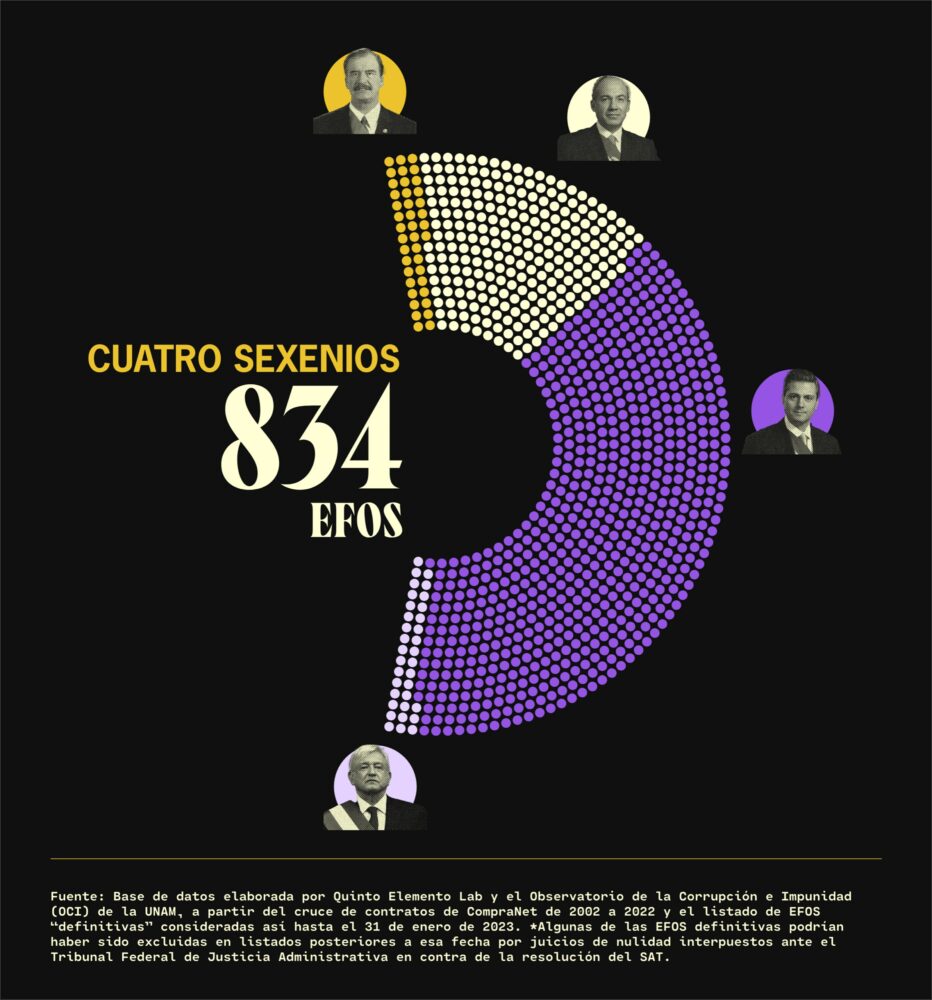 En las últimas dos décadas el gobierno federal ha mantenido una relación constante con EFOS. Los primeros registros de contratos con empresas fantasma se ubican desde la presidencia de Vicente Fox. En el sexenio de Felipe Calderón fue cuando estas empresas obtuvieron más dinero federal. Con Enrique Peña Nieto se multiplicaron los convenios. Y, pese al discurso anticorrupción, durante el periodo de Andrés Manuel López Obrador siguieron contratando a firmas inexistentes y se desplomó la identificación que hace el SAT de estas compañías.
