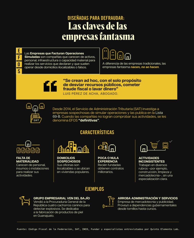 Durante los últimos cuatro sexenios el gobierno mexicano ha otorgado más de 11 mil 492 millones de pesos en contratos con dinero federal a Empresas que Facturan Operaciones Simuladas (EFOS), también conocidas como empresas fantasma, fachada, inexistentes o factureras.