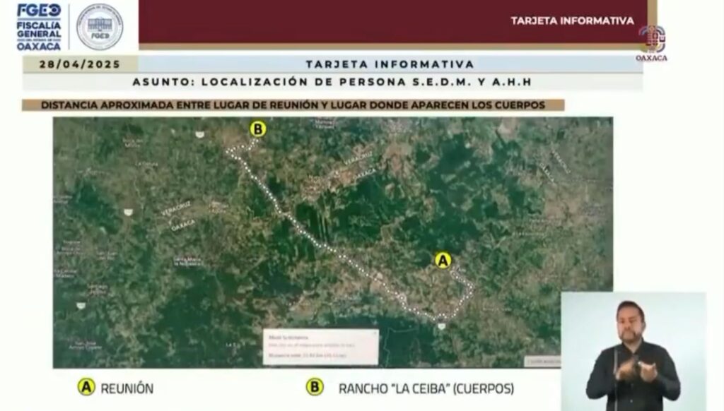 Esta mañana, en Palacio de Gobierno, la Fiscalía General del Estado de Oaxaca declaró en medio de una conferencia los hallazgos encontrados tras la aparición de la Sandra Domínguez y de su pareja Alexander Hernández Hernández en el rancho La Ceiba de 20 hectáreas ubicado en Unión Progreso Tatabari, Carpa, Veracruz, a 34 kilómetros donde fue secuestrada.