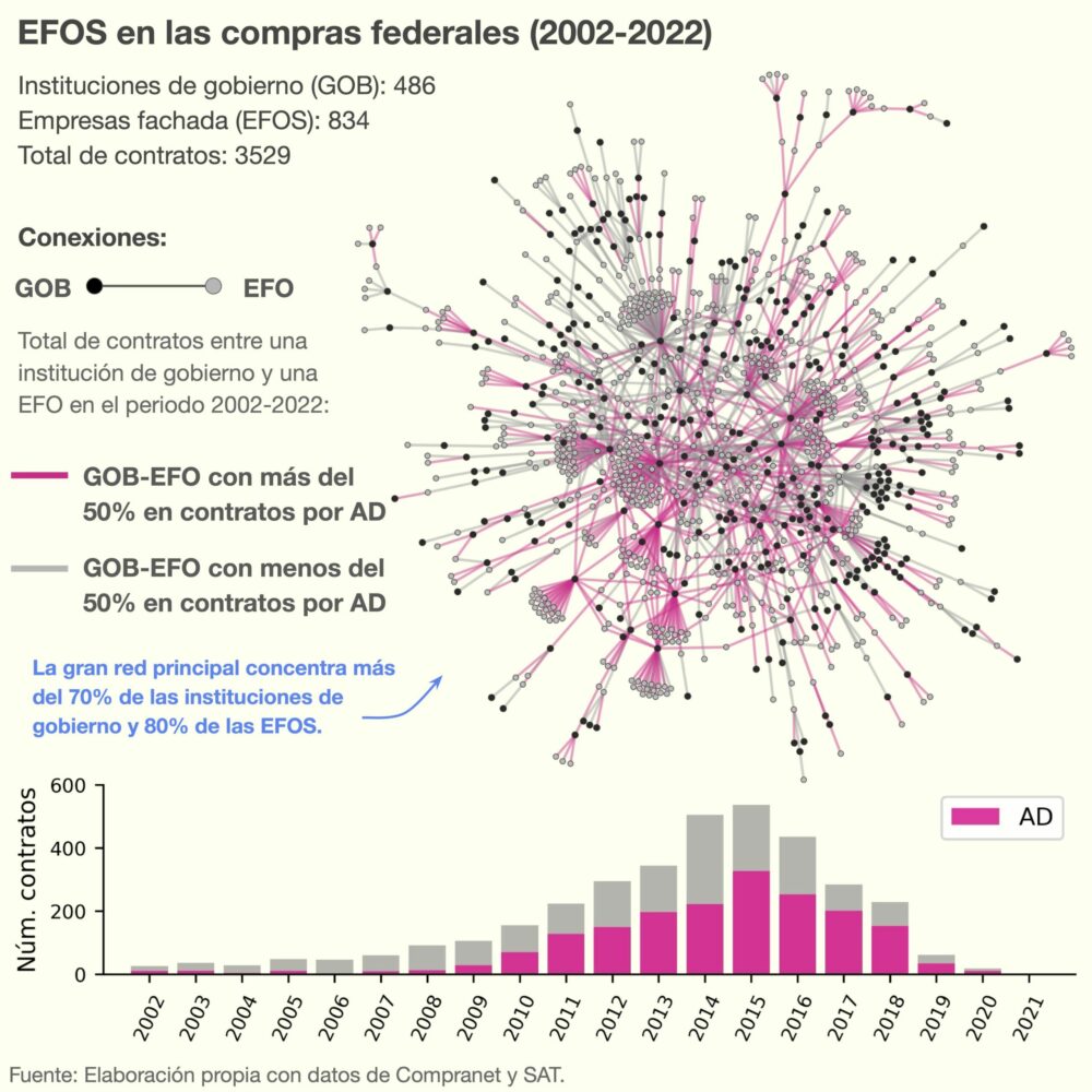 Un análisis realizado por el Observatorio de la Corrupción e Impunidad del Instituto de Investigaciones Jurídicas de la UNAM y Quinto Elemento Lab sobre las compras públicas federales revela que, durante las últimas dos décadas (2002-2022), al menos 486 dependencias del Gobierno federal establecieron 3 mil 529 contratos con por lo menos 834 empresas fachada catalogadas por el SAT como EFOS definitivas. El monto involucrado en estos contratos es cercano a los 11 mil 500 millones de pesos, con un impacto en todos los sectores del gobierno.
