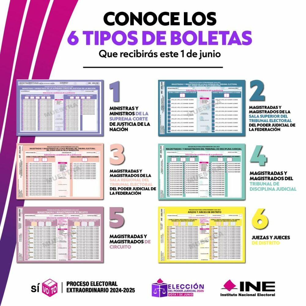 Para que podamos votarles, el INE realizó la impresión de 601 millones de boletas, las cuales cuentan con medidas de seguridad incorporadas tanto en la fabricación del papel como el proceso de impresión, a fin de garantizar su autenticidad e integridad. La distribución de la documentación comenzó este 30 de abril y se extenderá hasta el 17 de mayo. Lo que se usará en esta elección son un total de seis boletas para cada uno de los cargos de elección popular, las cuales se distinguen entre sí con los siguientes colores: