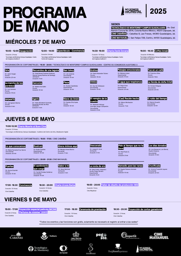 A la par de la proyección de cortometrajes y diálogos entre jóvenes realizadores y cineastas con trayectorias destacadas, la tercera edición del festival “No Somos de Cristal” tiene planeadas una serie de actividades para “fomentar el pensamiento crítico, la formación cinematográfica y la convivencia entre jóvenes realizadores, profesionales de la industria y público general”.