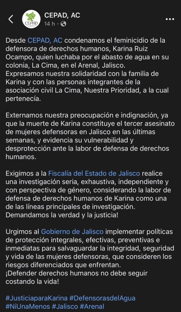En ese sentido, el Centro de Justicia para la Paz y el Desarrollo (CEPAD) también condenó los hechos y externó su preocupación e indignación, reconociendo que Karina es la tercera mujer defensora asesinada en las últimas semanas en el estado, situación que deja en evidencia “la vulnerabilidad y la desprotección” que enfrentan las mujeres que ejercen su derecho a defender derechos.