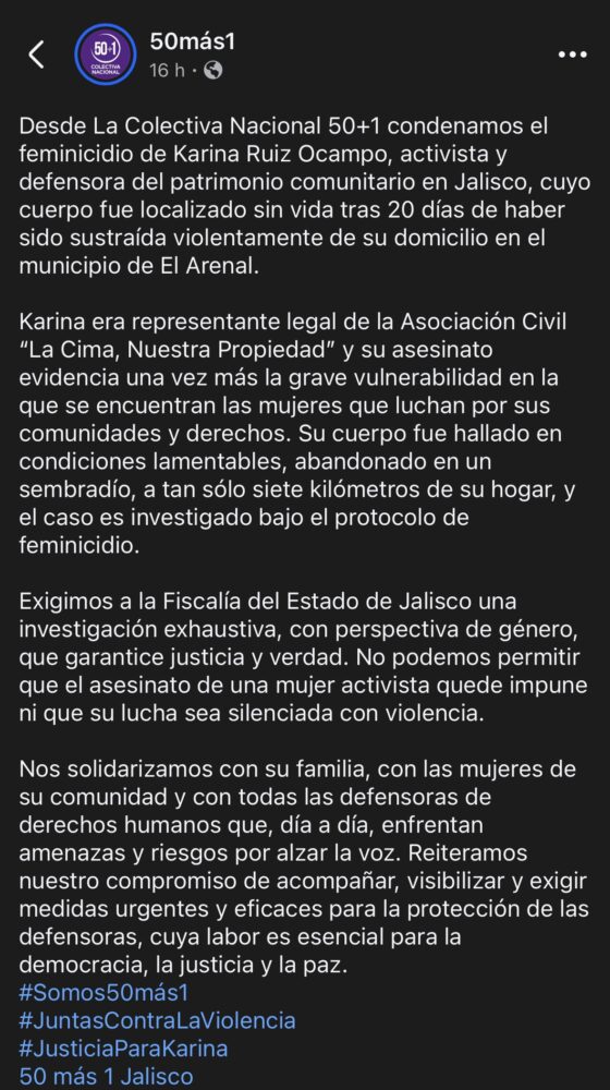 A este llamado se sumó también la Colectiva Nacional 50+1 quien cuestionó que su localización haya sido tardía y “a tan sólo siete kilómetros de su hogar”. Urgieron con ello una investigación bajo el Protocolo de feminicidio, con perspectiva de género y que garantice la justicia y la verdad “no podemos permitir que el asesinato de una mujer activista quede impune ni que su lucha sea silenciada con violencia” expresaron.