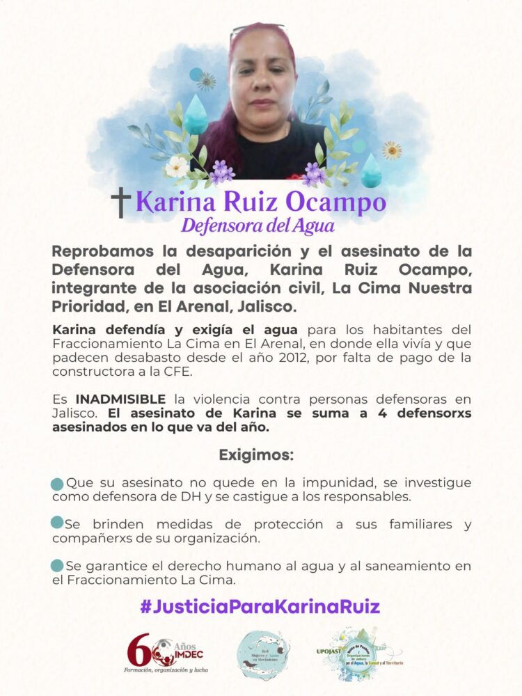 A través de un comunicado, el Instituto Mexicano para el Desarrollo Comunitario (IMDEC) se pronunció ante la desaparición y el feminicidio de la defensora del agua Karina Ruiz Ocampo, integrante de la asociación vecinal La Cima Nuestra Prioridad, en El Arenal, Jalisco.