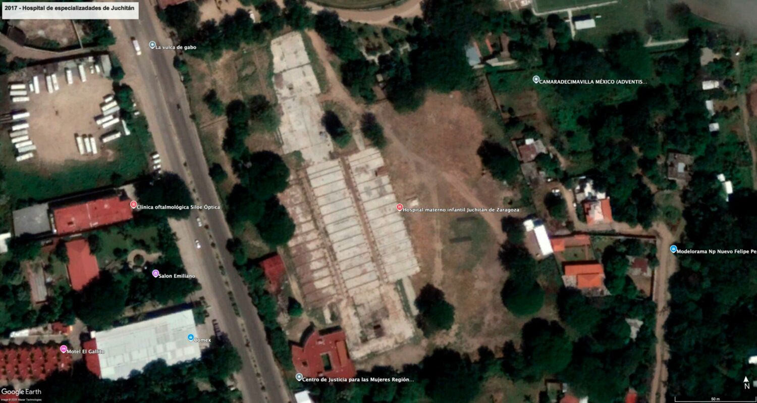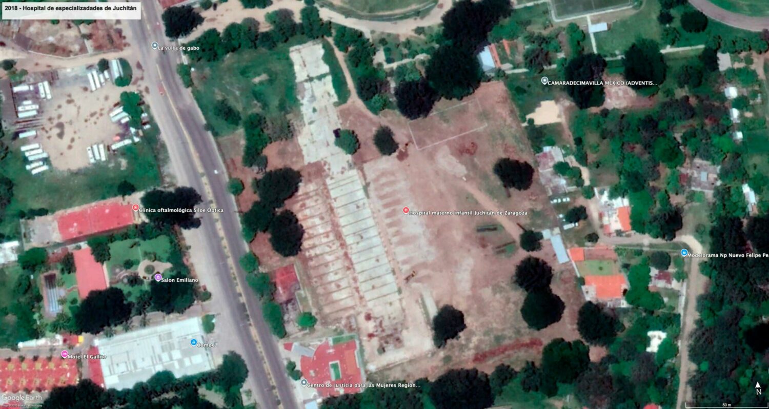 Desde que obtuvo el contrato en 2017, Constructora Kedmex no avanzó en la edificación del hospital, que tenía que estar listo a más tardar en agosto de 2019. El Gobierno de Oaxaca rescindió el contrato y en 2018 suscribió un convenio con Grupo México para que terminara la obra. El nosocomio empezó a funcionar formalmente hasta 2023. Imágenes: Google Earth y cuenta oficial de X de Alejandro Murat