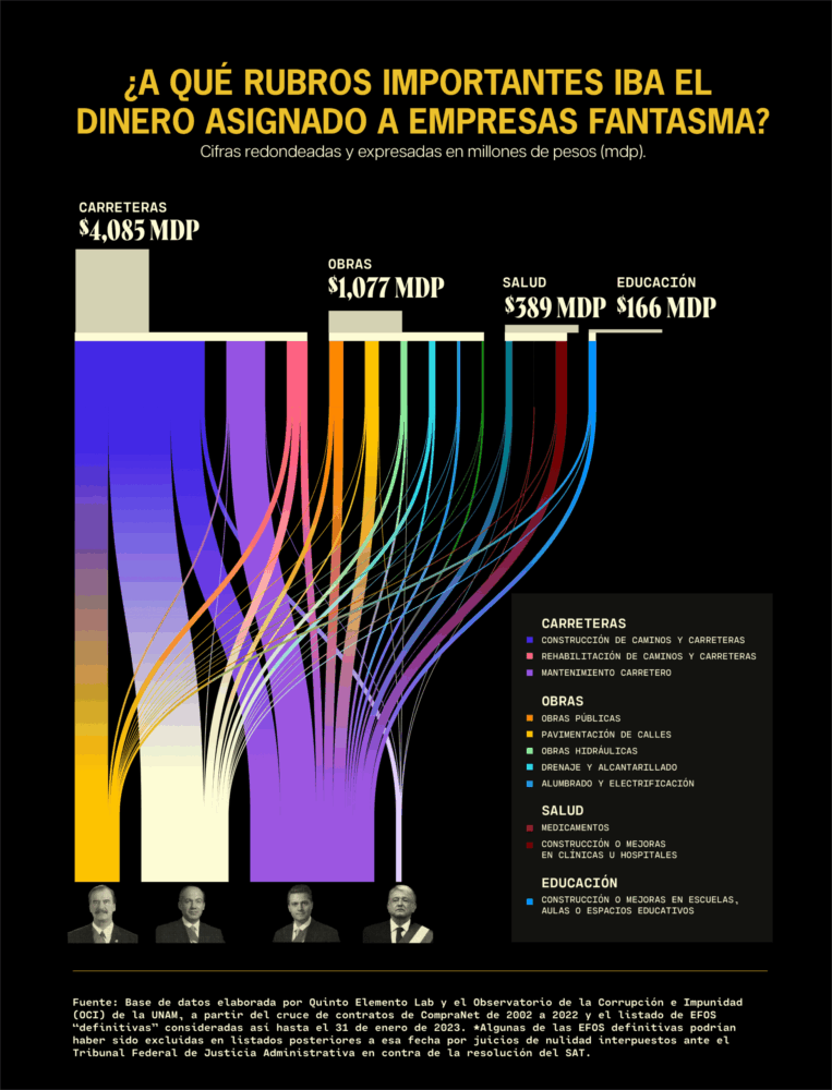 Más de 4 mil millones de pesos se distribuyeron entre 81 factureras a través de 330 contratos para ese tipo de obras, según la base de datos con información de Compranet y el listado del SAT de empresas declaradas EFOS definitivas al corte del 31 de enero de 2023, elaborada por Quinto Elemento Lab y el Observatorio de la Corrupción e Impunidad (OCI) de la Universidad Nacional Autónoma de México.