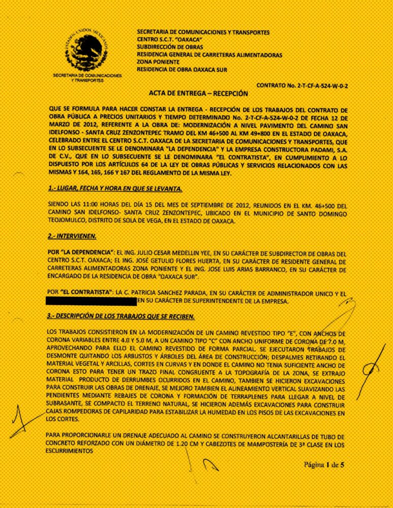 Por ejemplo, en 2010, la SICT contrató a Consorcio Corporativo de Construcción en México (Cocomex) para realizar la ampliación de un tramo de la carretera Oaxaca-Puerto Escondido. La firma recibió un anticipo de más de 10 millones de pesos, pero dejó el camino inconcluso luego de múltiples retrasos causados, según su representante legal, por “la terrible inseguridad que agobia al país en general”. En los últimos recorridos de la secretaría por la obra, el personal de la empresa ni siquiera se presentó.