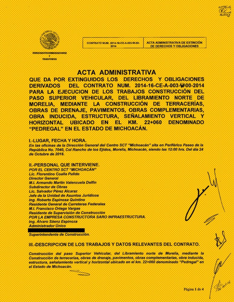 De ambos contratos la SICT expidió a Saro Infraestructura las actas de extinción de derechos y obligaciones que amparaban el cumplimiento de la compañía “en tiempo y forma”, conforme a “las normas de calidad” y “las especificaciones generales y particulares”.