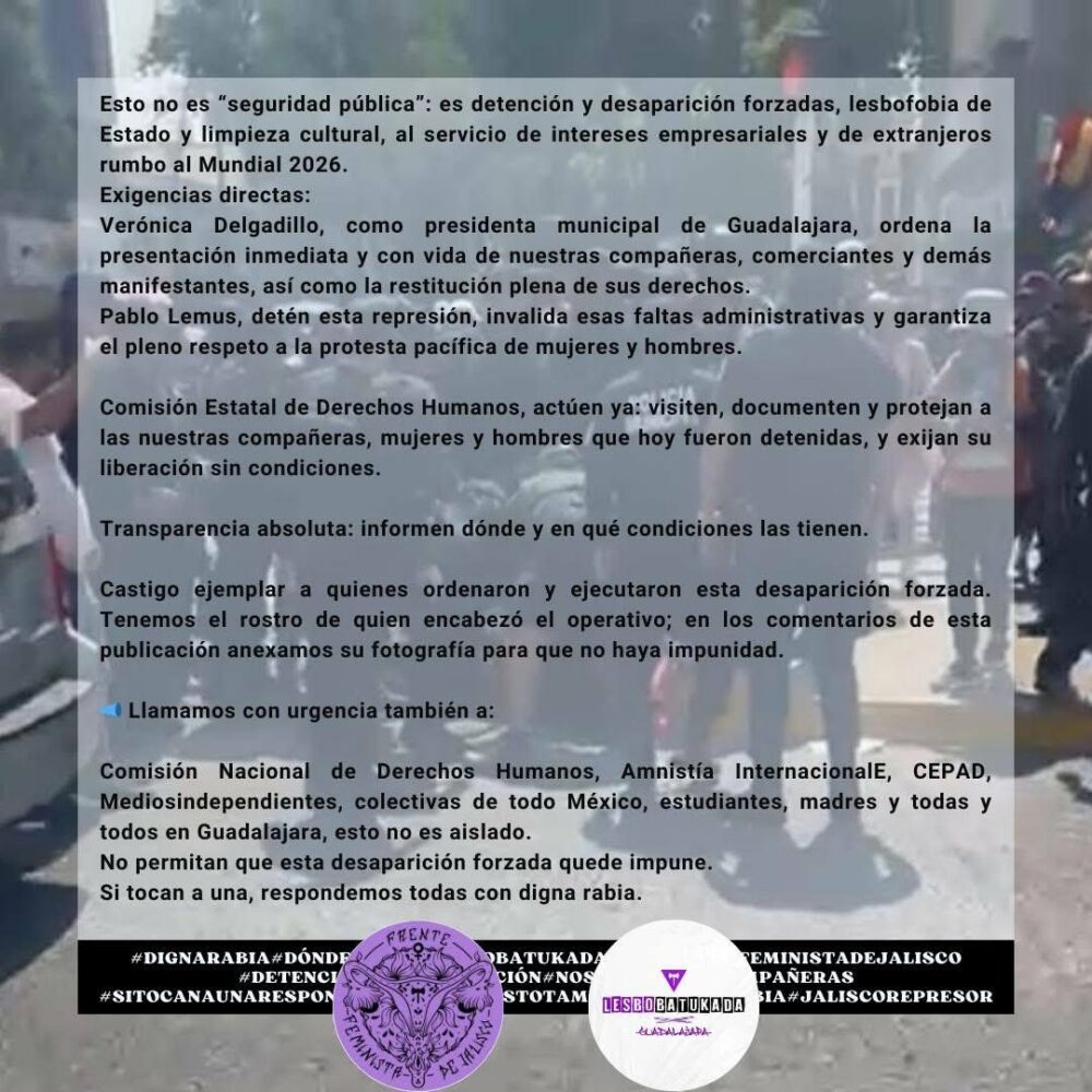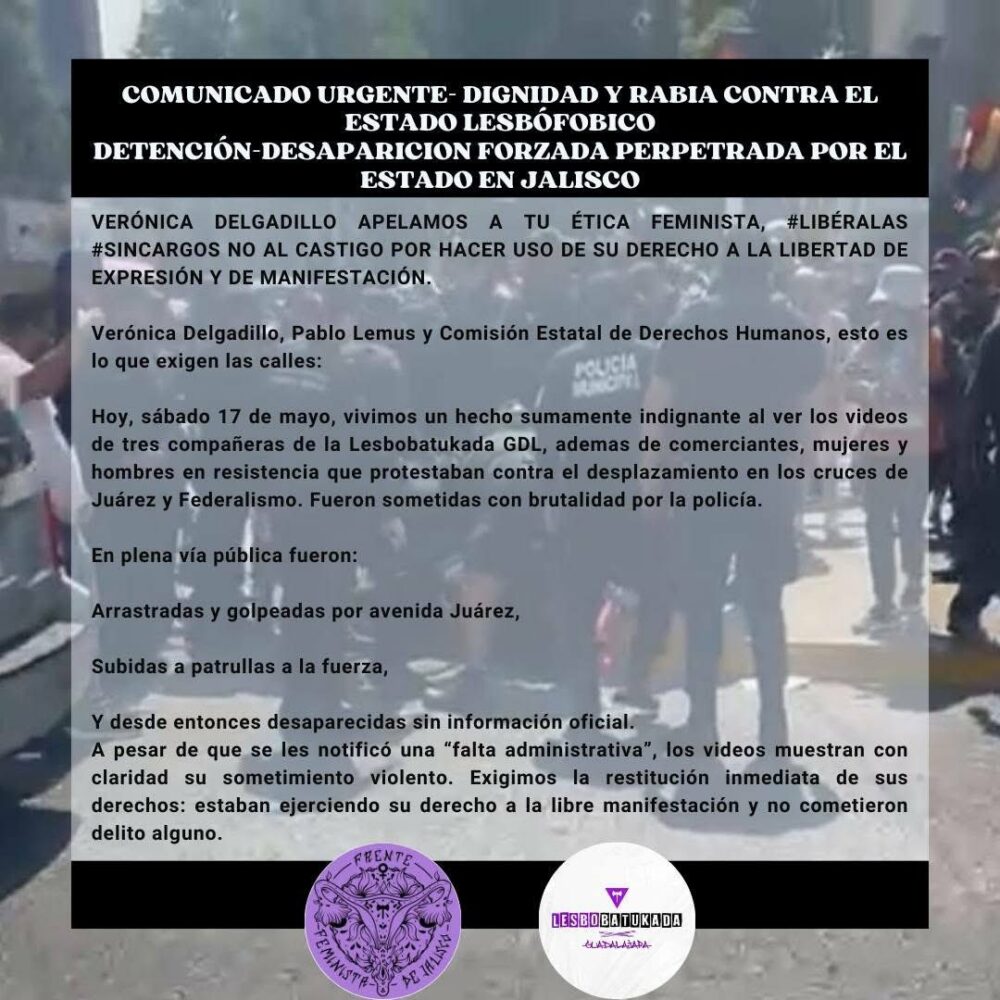 Por su parte, el Frente Feminista de Jalisco, a través de un comunicado exigió a Verónica Delgadillo, presidenta municipal de Guadalajara, la liberación de las tres compañeras. Denunciando, además, que la policía las golpeó y arrastró en la vía pública, lo que para el Frente constituyó actos de represión que derivaron en lesbofobia, detención arbitraria y desaparición forzada, esto por el tiempo en que no supieron a dónde habían sido llevadas las tres integrantes de la colectiva Lesbobatukada GDL.