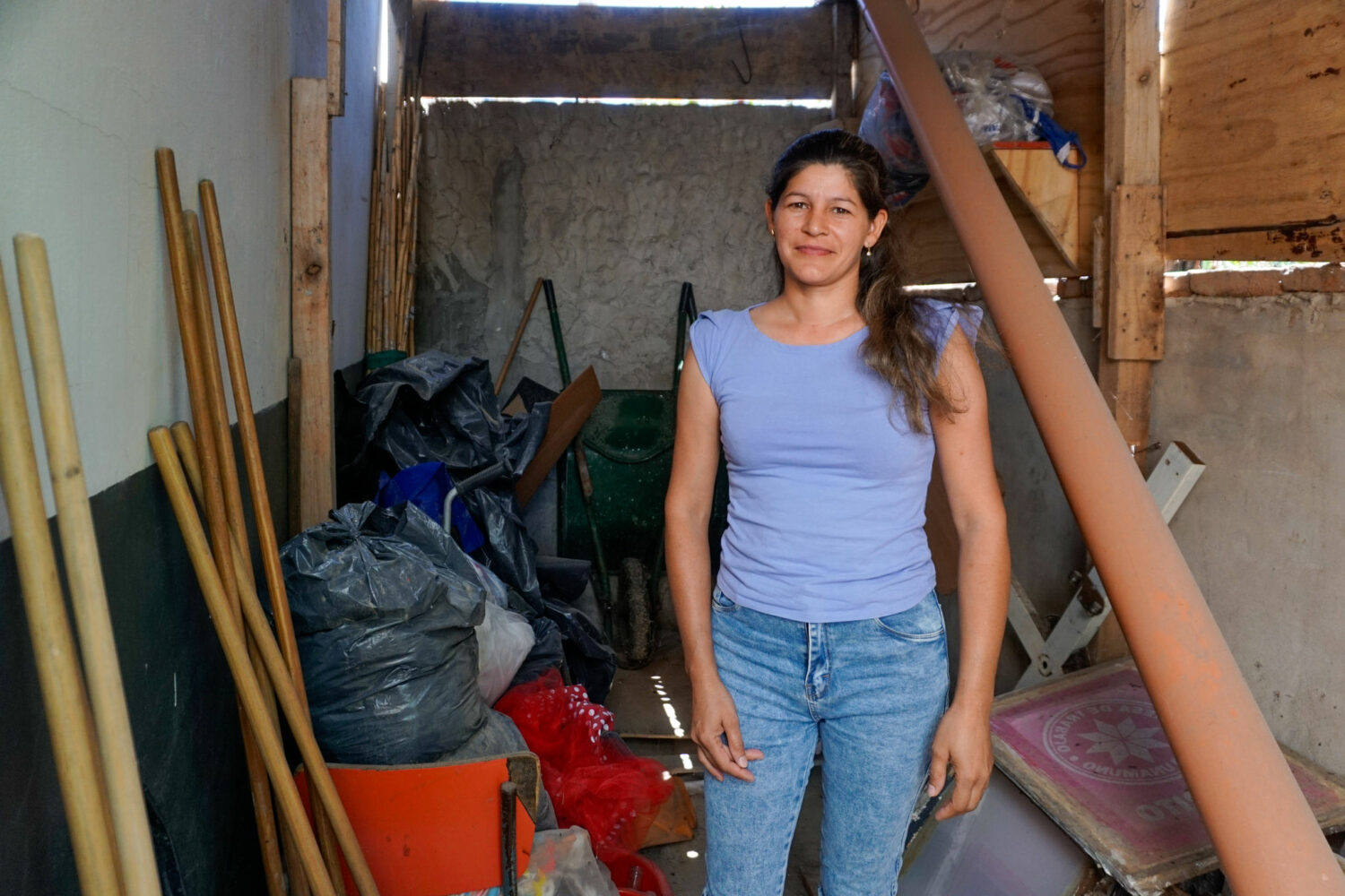 Emilia Torres posa con las herramientas que solía usar para limpiar las calles y veredas de su barrio como parte del programa Potenciar Trabajo en El Paredón. Sin el subsidio ni los insumos que enviaba el gobierno, Torres dice que la cooperativa local ya no puede funcionar.