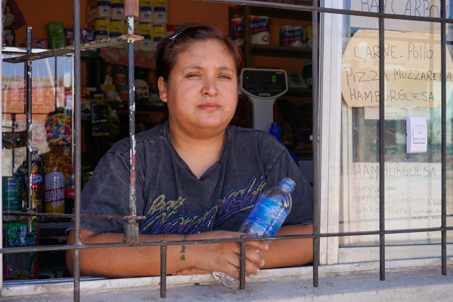 Rocío Rojas espera a los clientes en la ventanilla de su almacén de barrio. Rojas dice que los vecinos muchas veces no pueden guardar la basura por mucho tiempo y la basura se acumula en las esquinas.