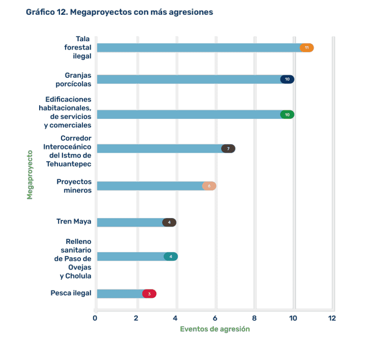 En el “Informe sobre la situación de las personas y comunidades defensoras de los derechos humanos ambientales en México 2024”, del Centro Mexicano de Derecho Ambiental (CEMDA), publicado este año, hay un apartado dedicado a las agresiones que existen en zonas donde se establecen megaproyectos.