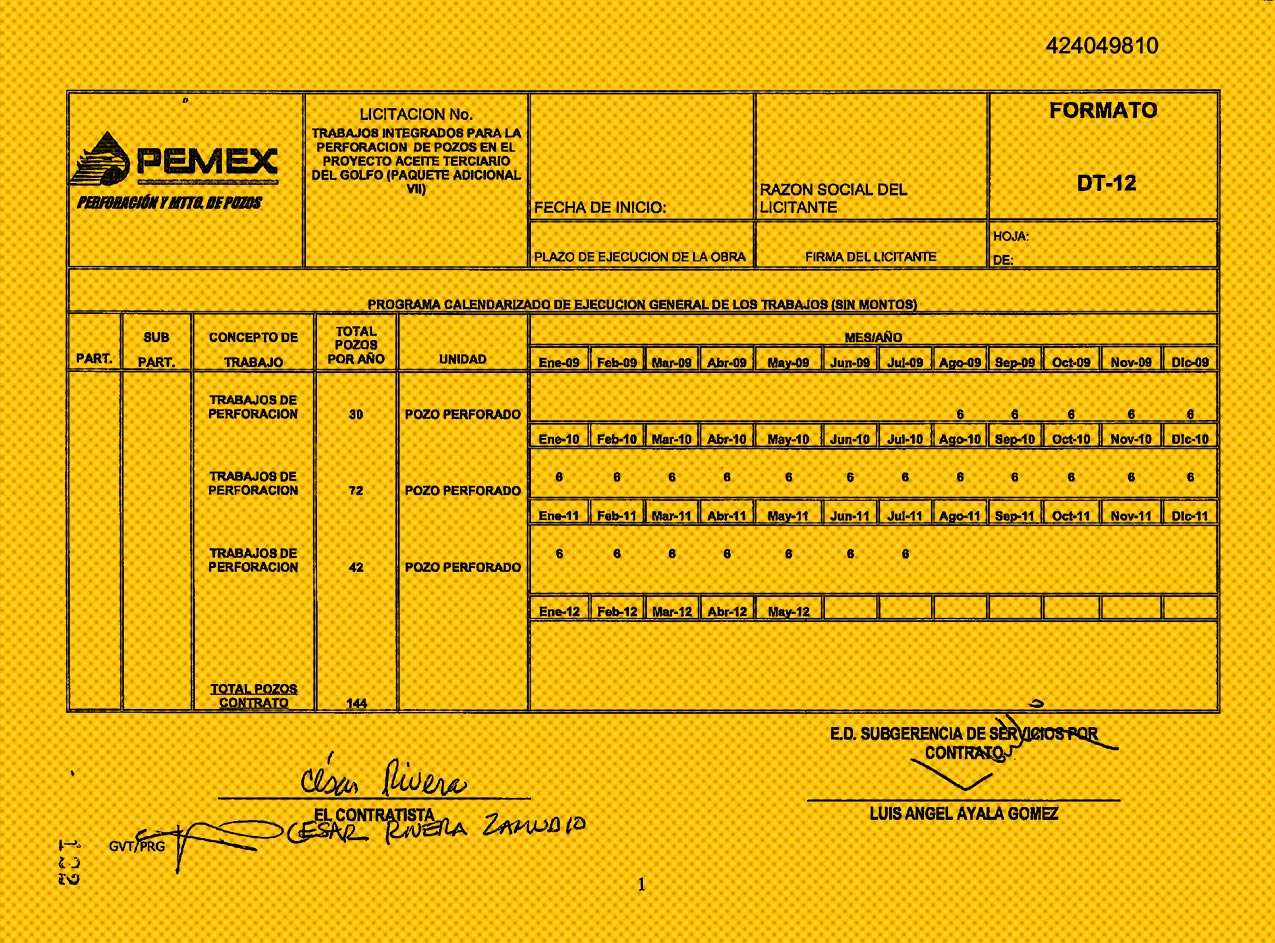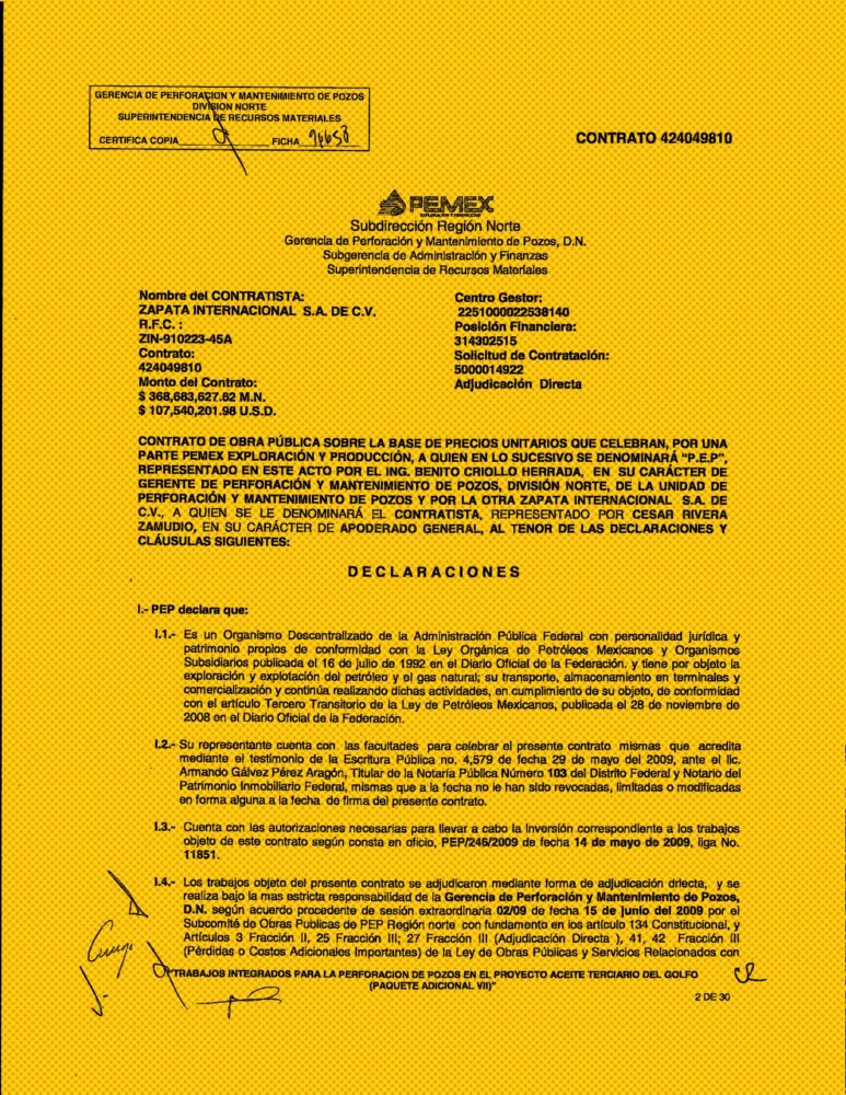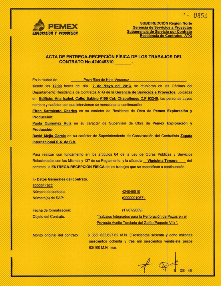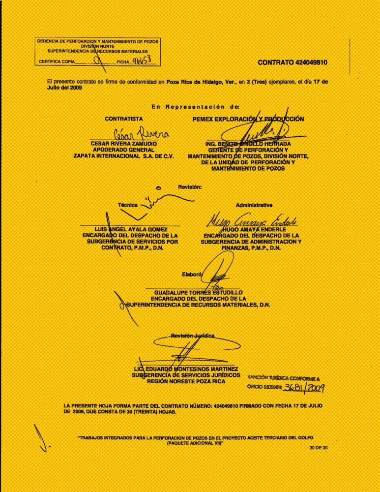 Del total de mil 779 pozos proyectados para 2009, PEP encargó a Zapata Internacional perforar 144 y hacer trabajos complementarios en siete. Según el contrato, firmado por Rivera Zamudio, apoderado de la empresa, y cinco funcionarios de la Unidad de Perforación y Mantenimiento de Pozos de la División Norte de PEP, las obras arrancaron el 17 de junio de 2009 y debían estar listas el 16 de julio de 2011.