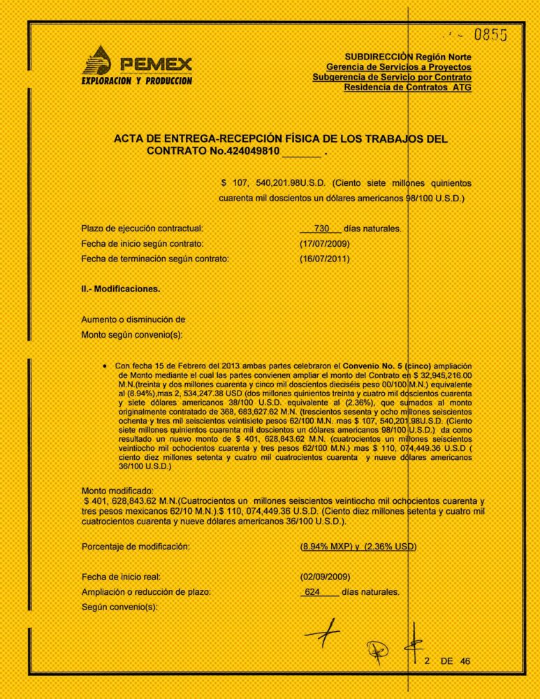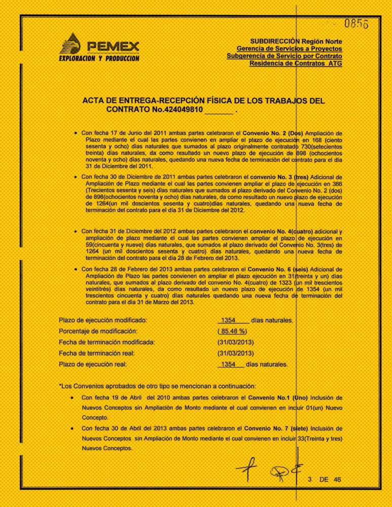 Finalmente, tras cuatro aplazamientos, Zapata Internacional entregó los pozos en mayo de 2013, un año y ocho meses más tarde —casi el doble del tiempo establecido— de lo acordado en el contrato inicial. Pemex solo penalizó a la empresa fachada por retrasos de 168.81 días, cuando en realidad necesitó 624 días adicionales para terminar las obras.