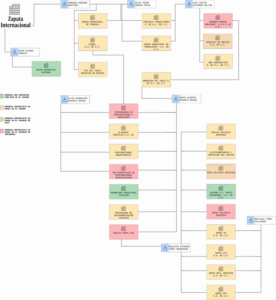 Al mismo tiempo, Zapata Internacional se conecta con dos grandes brazos, compuestos, sobre todo, por compañías petroleras. El vínculo se explica a partir de Edmundo Andrade Martínez, un hombre originario de Tabasco, actualmente de 66 años. Además de ser el representante encargado de solicitar la disolución de la empresa ante la Secretaría de Economía, poseía acciones de Grupo Industrial de Tabasco, Ciabe y OTS Oil Tools Services.