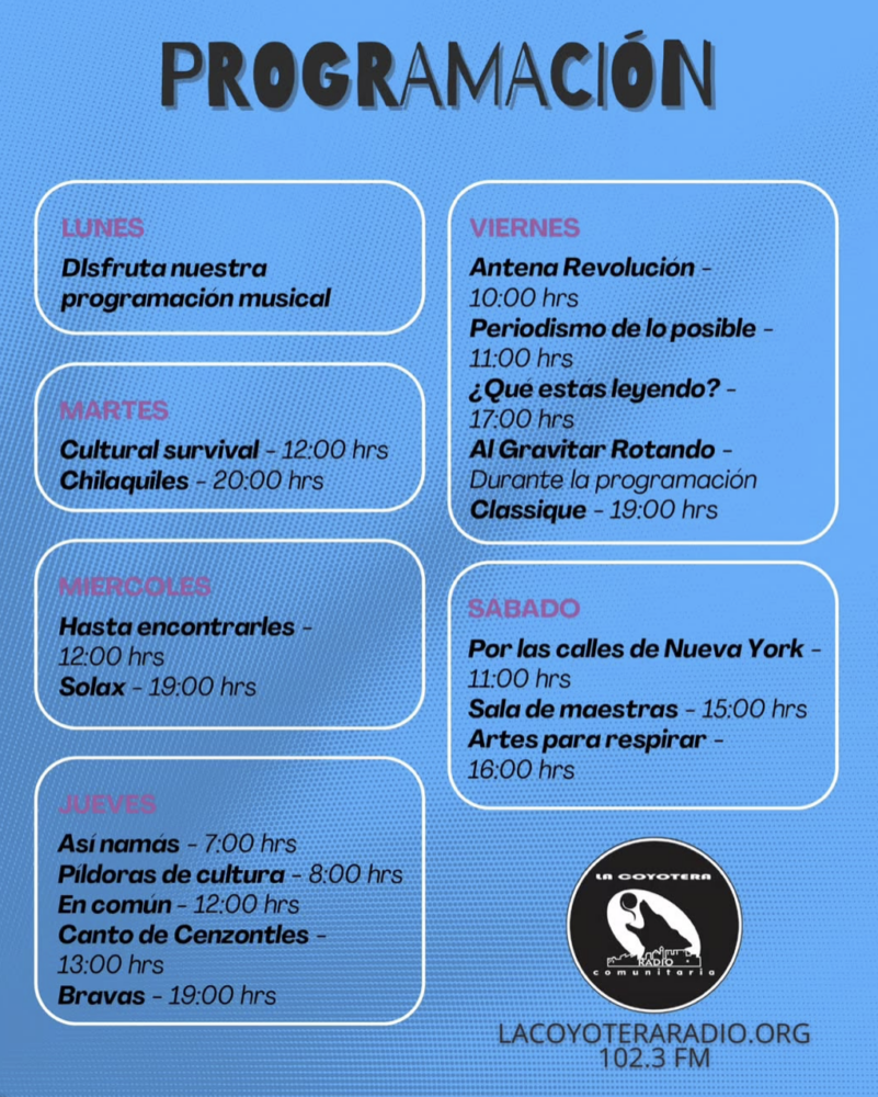Ximena González, parte del equipo de La Coyotera comenta que la elección de programas se realizó de manera democrática y tomando en cuenta que fueran parte de las líneas de acción de La Coyotera, además se buscó contar con una variedad de contenidos preparados que, por ahora, van desde finanzas personales, feminismos, literatura y, obviamente, de música.
