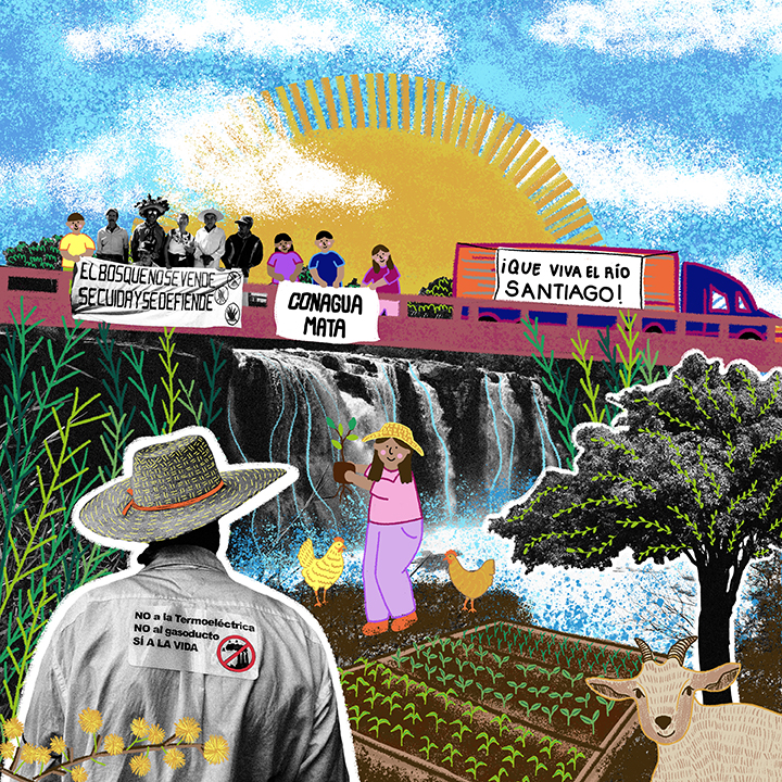 La defensa del río Santiago se ha hecho a través de manifestaciones, recorridos por el río para documentar las descargas industriales y evidenciar los daños y la creación de un vivero comunitario que se convirtió en un refugio para la vida natural y un símbolo de esperanza. La comunidad sembró miles de árboles en un intento por regenerar su entorno y restaurar el ecosistema del río, desafiando los megaproyectos que siguen amenazando su tierra.
