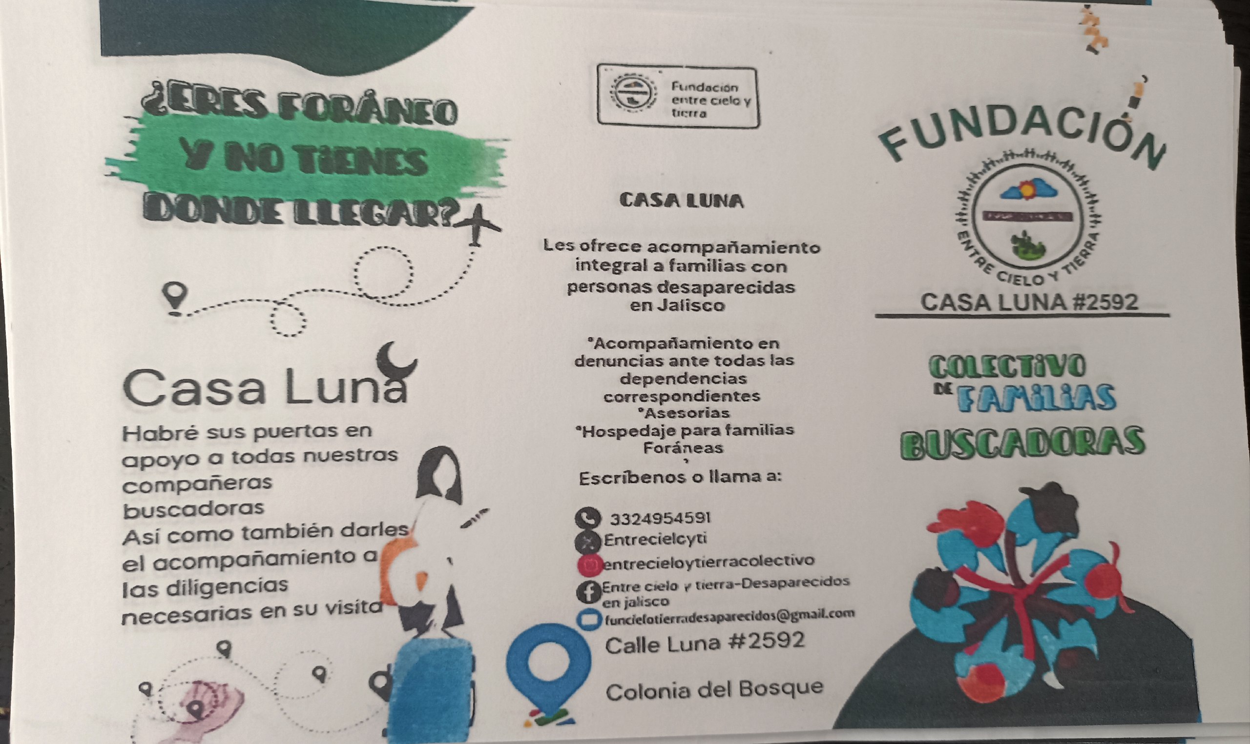 Para hacer ese camino menos sinuoso, madres buscadoras de la Fundación Entre Cielo y Tierra Desaparecidos en Jalisco inauguraron Casa Luna, un espacio en el que las familias buscadoras pueden descansar, tener apoyo emocional, psicológico e integral durante su estancia en la Zona Metropolitana de Guadalajara, región que concentra a las principales dependencias obligadas a la búsqueda de personas desaparecidas en el estado.
