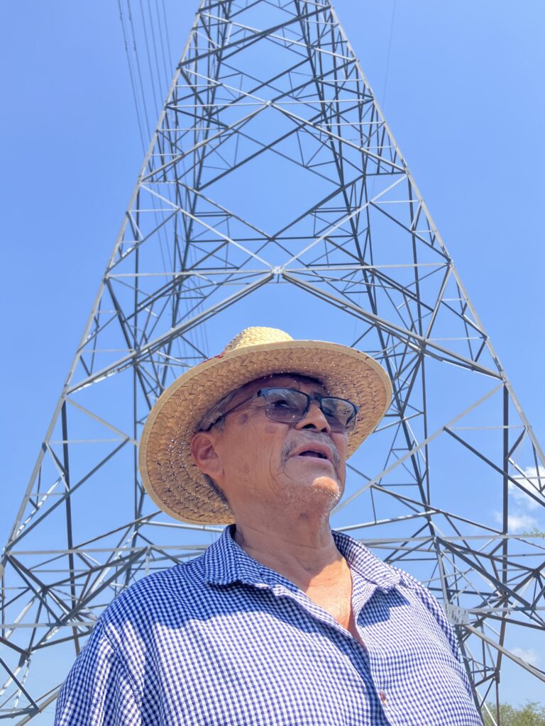 Recorre sus tierras mostrando que antes sembraba maíz, sorgo y ajonjolí y ahora no puede, porque en las 6 hectáreas de su terreno colocaron 3 torres de alta tensión de unos 40 metros cada uno.