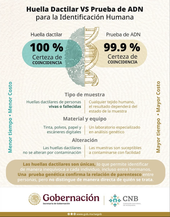 A finales del pasado diciembre, una publicación de la CNB en X —que posteriormente fue borrada— afirmaba que esa técnica tiene una certeza de coincidencia del 100%, y resultados en menor tiempo y con menos costo, en comparación con las pruebas de ADN.