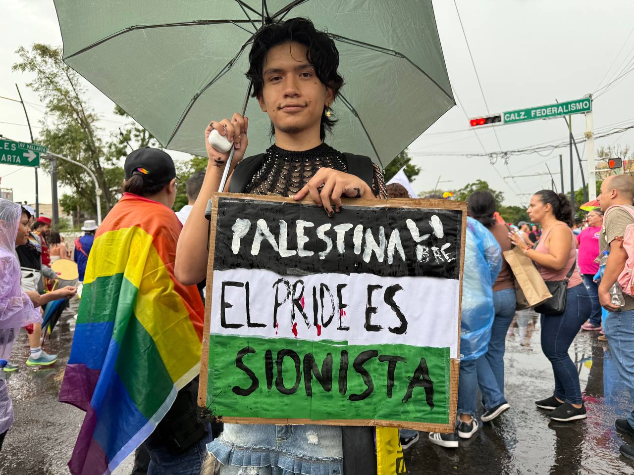 Pero no todo era júbilo. En la marcha también se encontraba Brian, una persona no binaria que utilizó un cartel con la frase “El Pride es sionista” para expresar su inconformidad con la comercialización del evento.