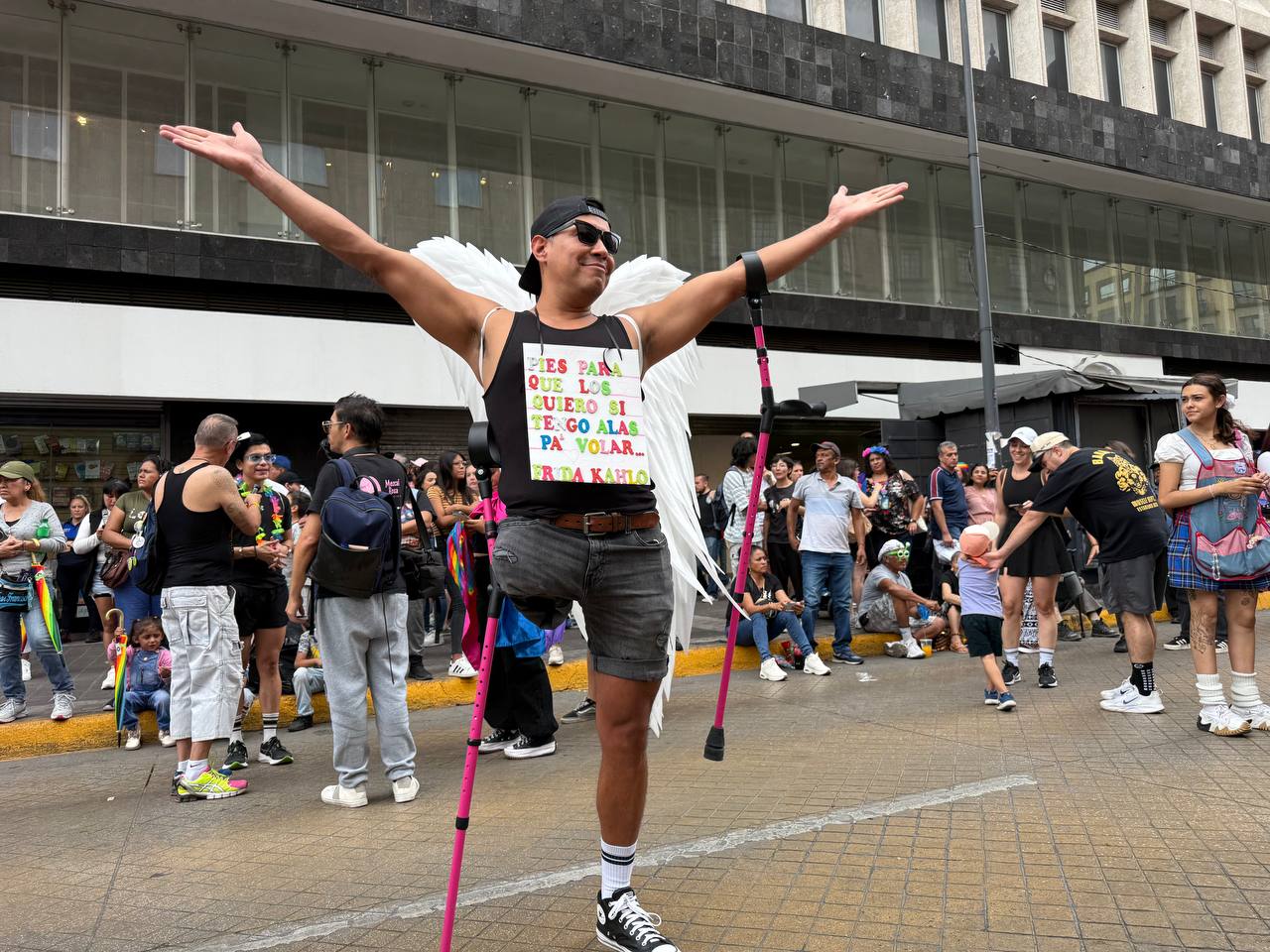En el mismo contingente de personas con discapacidad se encontraba Juan, una persona amputada que desfiló con alas blancas. Para él, marchar es un acto de libertad y amor propio: “Muchos aún nos tachan de enfermos, pero esto es solo otra forma de ser, de amar”.