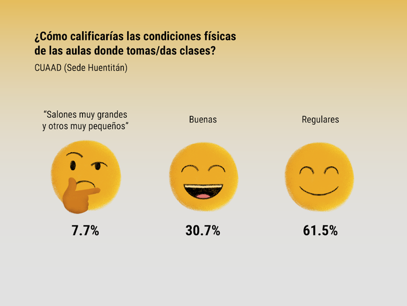 En las encuestas aplicadas en Santa María de Gracia, San Agustín y Huentitán, los estudiantes,  señalaron que los problemas no se limitan a la infraestructura, sino a las otras condiciones que comprenden su desarrollo profesional:
