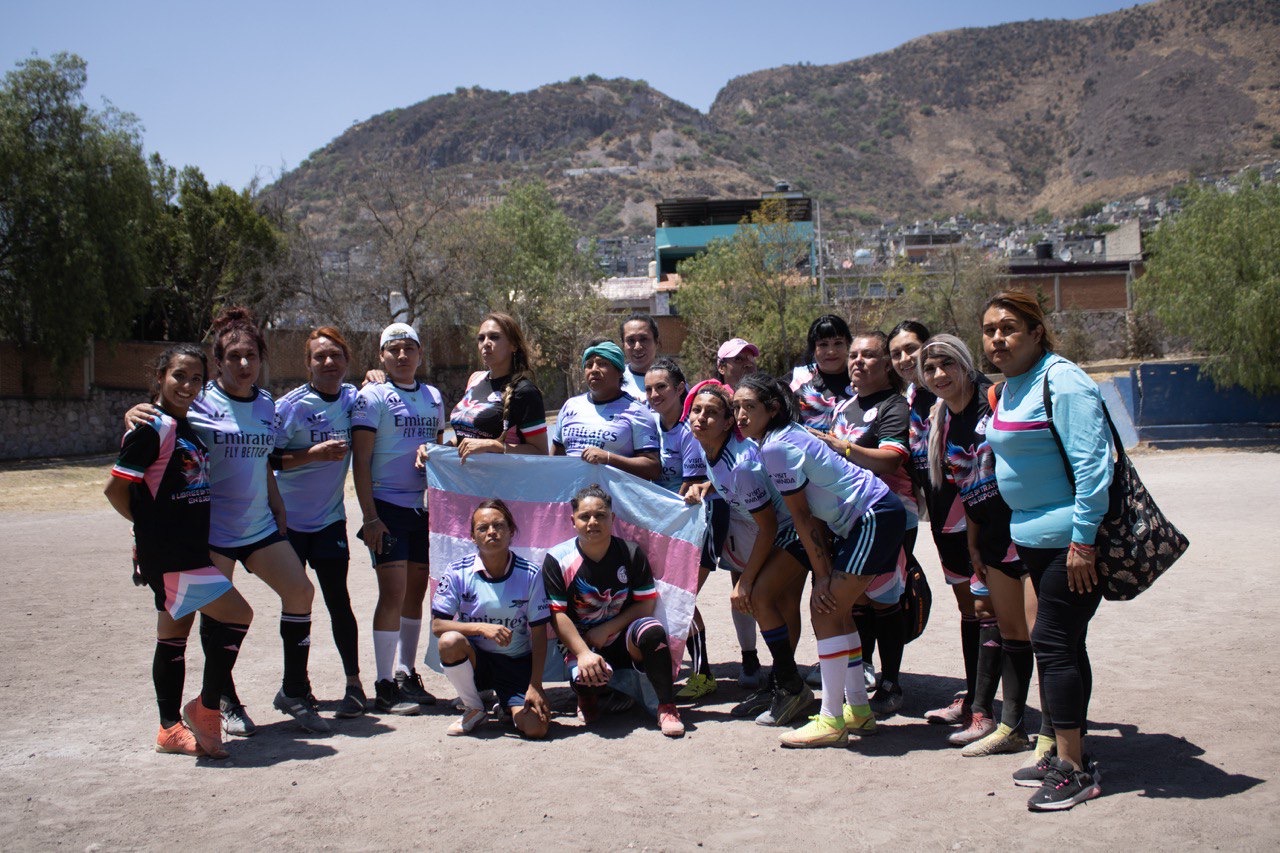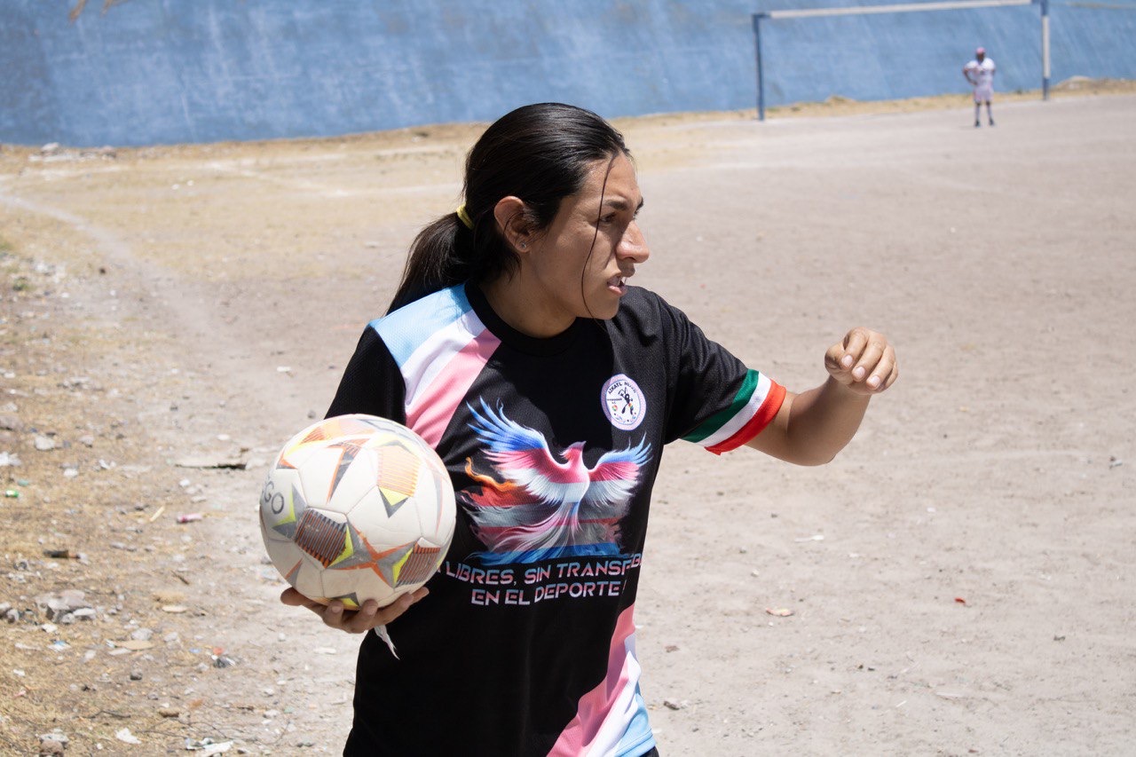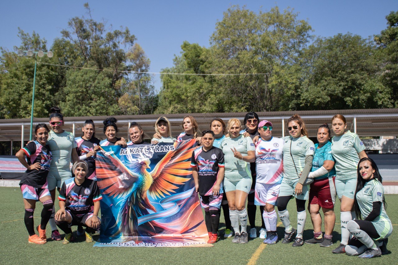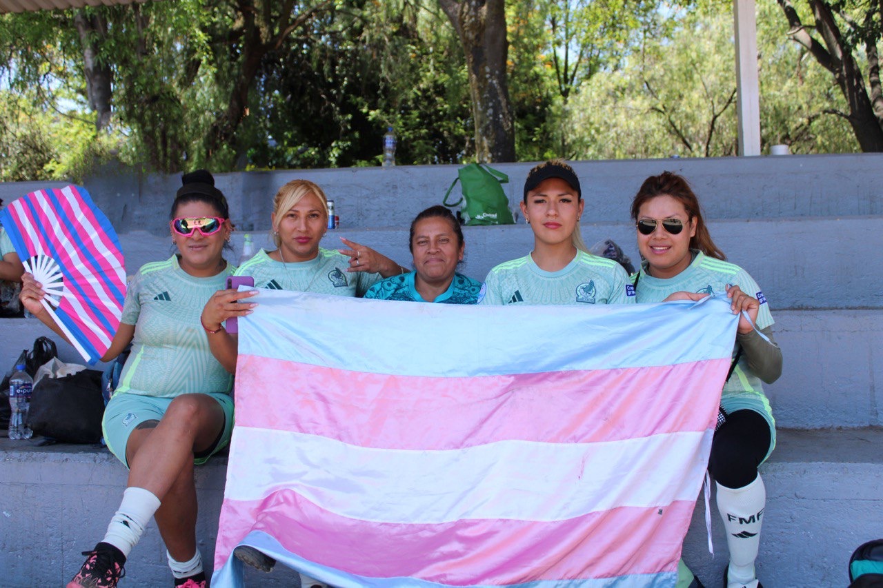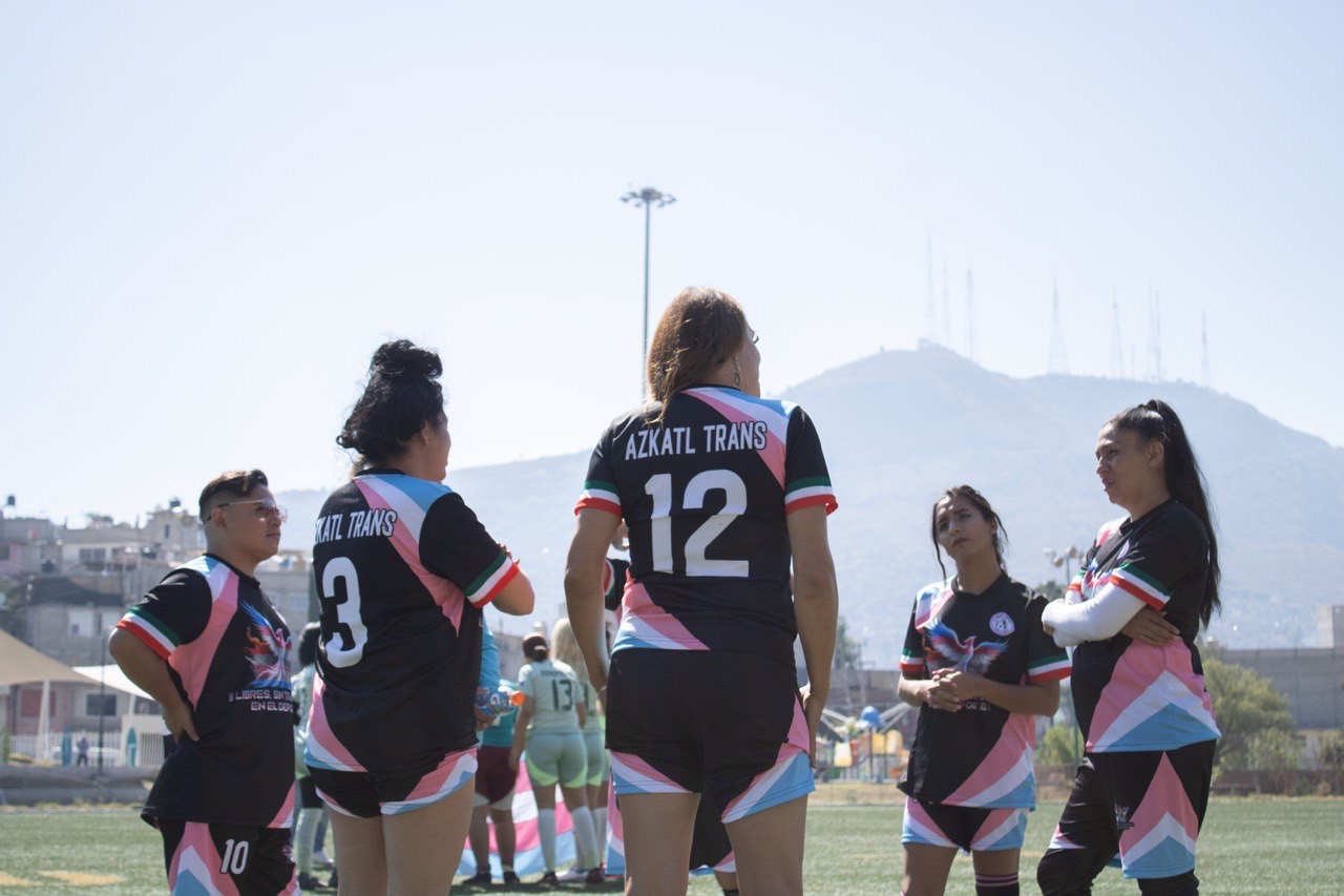 “Para ser mi primera vez jugando con ustedes, estamos jugando muy bien”, comenta una integrante de Arcoiris Trans a sus compañeras durante el medio tiempo. En la playera de sus contrincantes se puede leer la leyenda “Libres, sin transfobia en el deporte”.