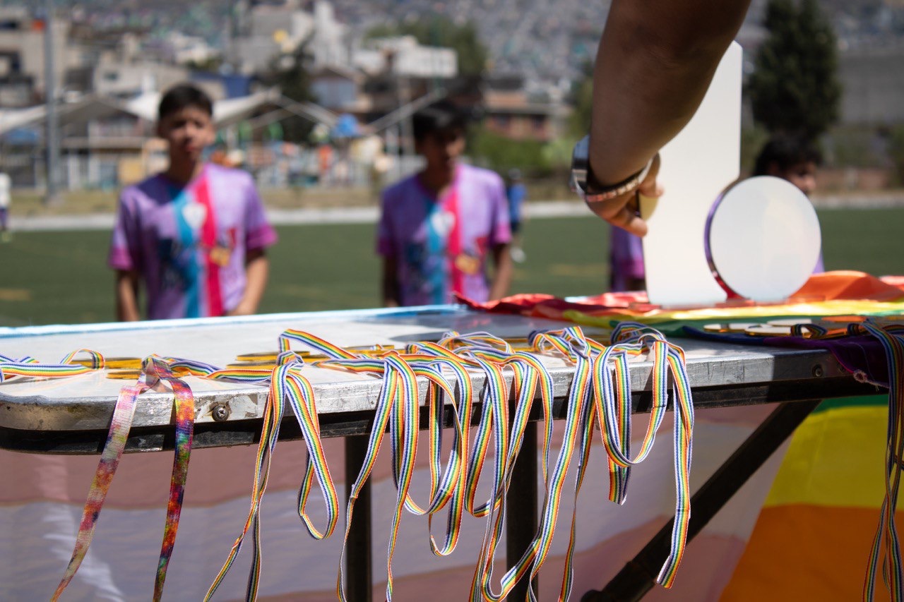 Todas las personas asistentes al primer Cuadrangular LGBT + Trans en Cuautepec, se mueven rápidamente a la cancha de pasto sintético. Ya está colocada la tarima donde serán entregadas las medallas. En las gradas las personas platican. La comida que será ofrecida a asistentes y participantes ha llegado y se coloca detrás de una extensa bandera con cinco franjas horizontales: una superior e inferior de color celeste, dos de color rosa claro y una blanca en el centro. La bandera trans. La final LGBT se disputa entre Azkatl Varonil y Lobos. El marcador está reñido, por lo que, ante un inminente empate se irán a penales.