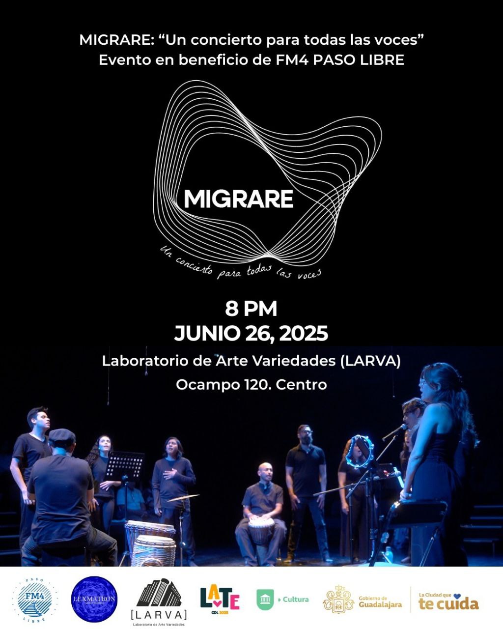 Este 26 de junio se llevará a cabo el evento “Migrare:un concierto para todas las voces”, la cual será una experiencia artística inmersiva que entrelaza música en vivo, narrativas humanas y performance para sensibilizar sobre la movilidad humana. El dinero recaudado será donado al Centro de Atención a Personas Migrantes y Refugiadas FM4 Paso Libre.
