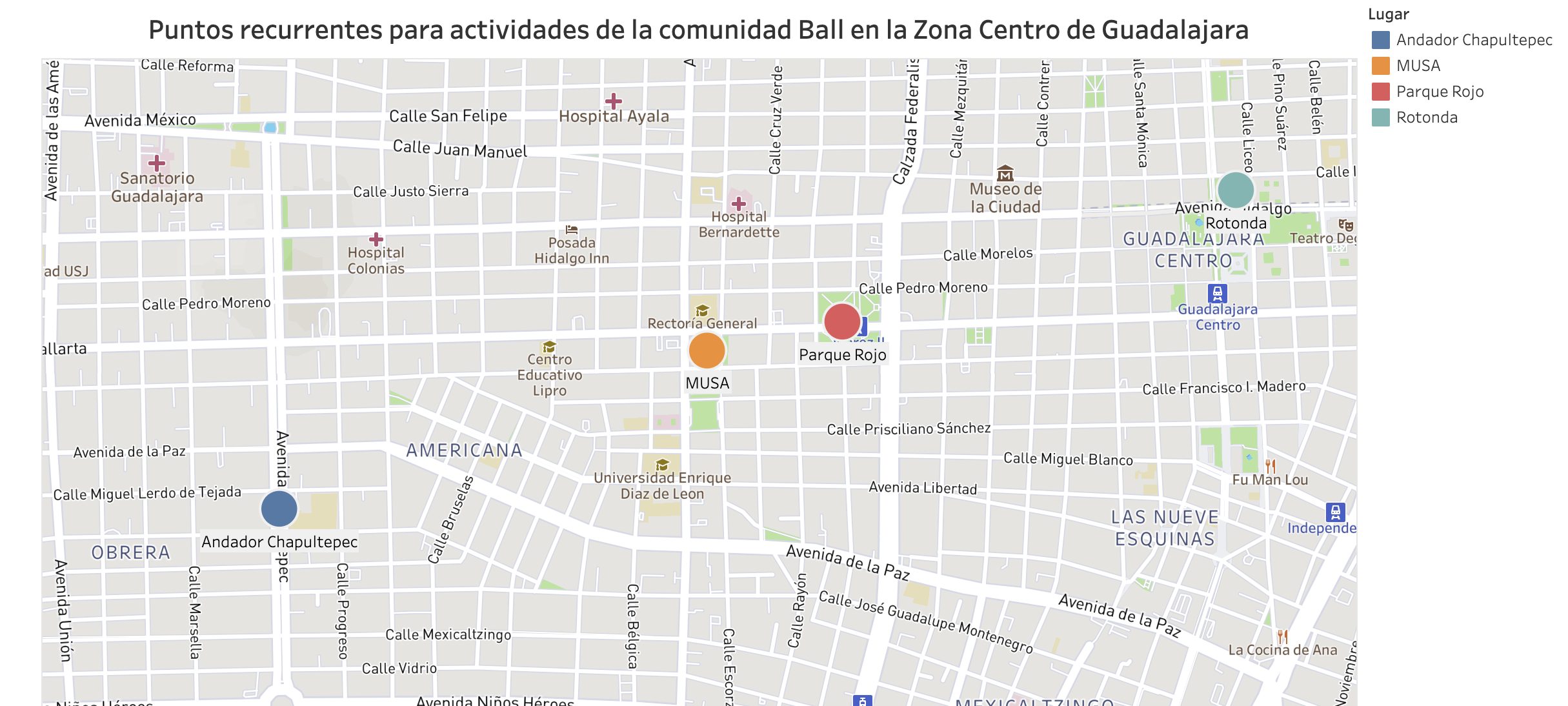 Mapa sobre los puntos recurrentes de encuentro para actividades de la comunidad Ball en la Zona Centro de Guadalajara. Los datos se obtuvieron a través de un formulario en línea.
