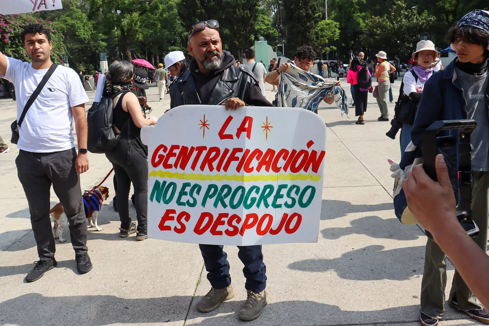 El Frente Antigentrificación CDMX convocó a un mitin y marcha en el Parque México, ubicado en la colonia Condesa, para visibilizar los efectos negativos de la gentrificación en la Ciudad de México: el aumento de los precios de renta, el desplazamiento de comunidades originarias, la pérdida del comercio local y la transformación cultural impuesta por intereses extranjeros y nómadas digitales.