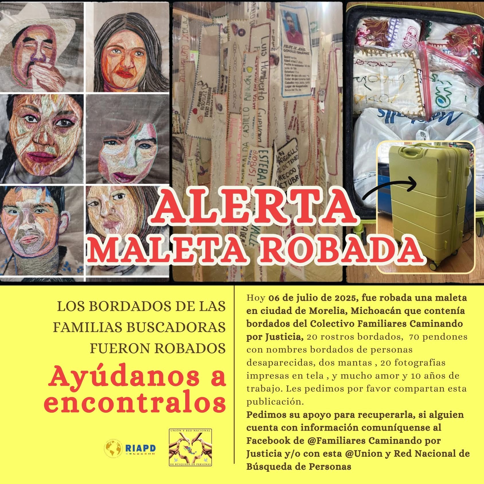 La maleta de color verde llevaba en su interior 20 rostros bordados de personas desaparecidas, 70 pendones con nombres bordados, 2 mantas con mensajes de exigencia y esperanza y 20 fotografías impresas en tela. La obra “Bordarles a todos”, que ahí fue robada, fue elaborada por más de 70 colectivos de personas desaparecidas del país. Además, entre las piezas hay trabajos de las artistas Rosa Borrás, Tania Olea y Cordelia Rizzo.