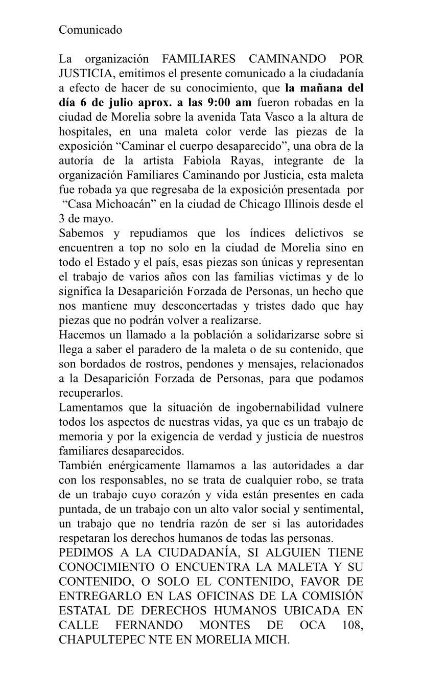 Su mensaje atiende a la rabia, la indignación y la denuncia pública que ha generado el robo de la maleta que llevaba en su interior las piezas que conforman esta exposición, el pasado sábado 6 de julio en la ciudad de Morelia, Michoacán.