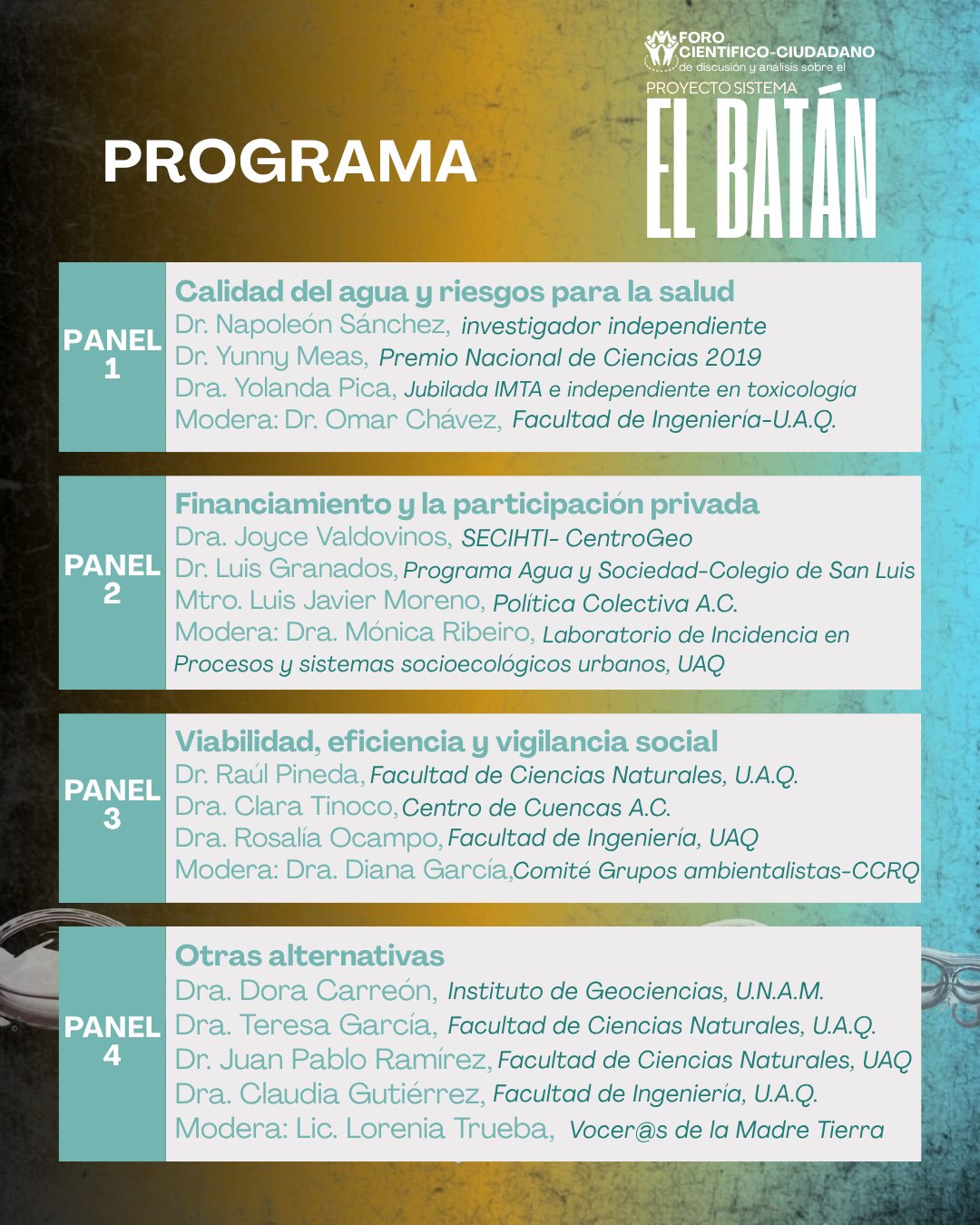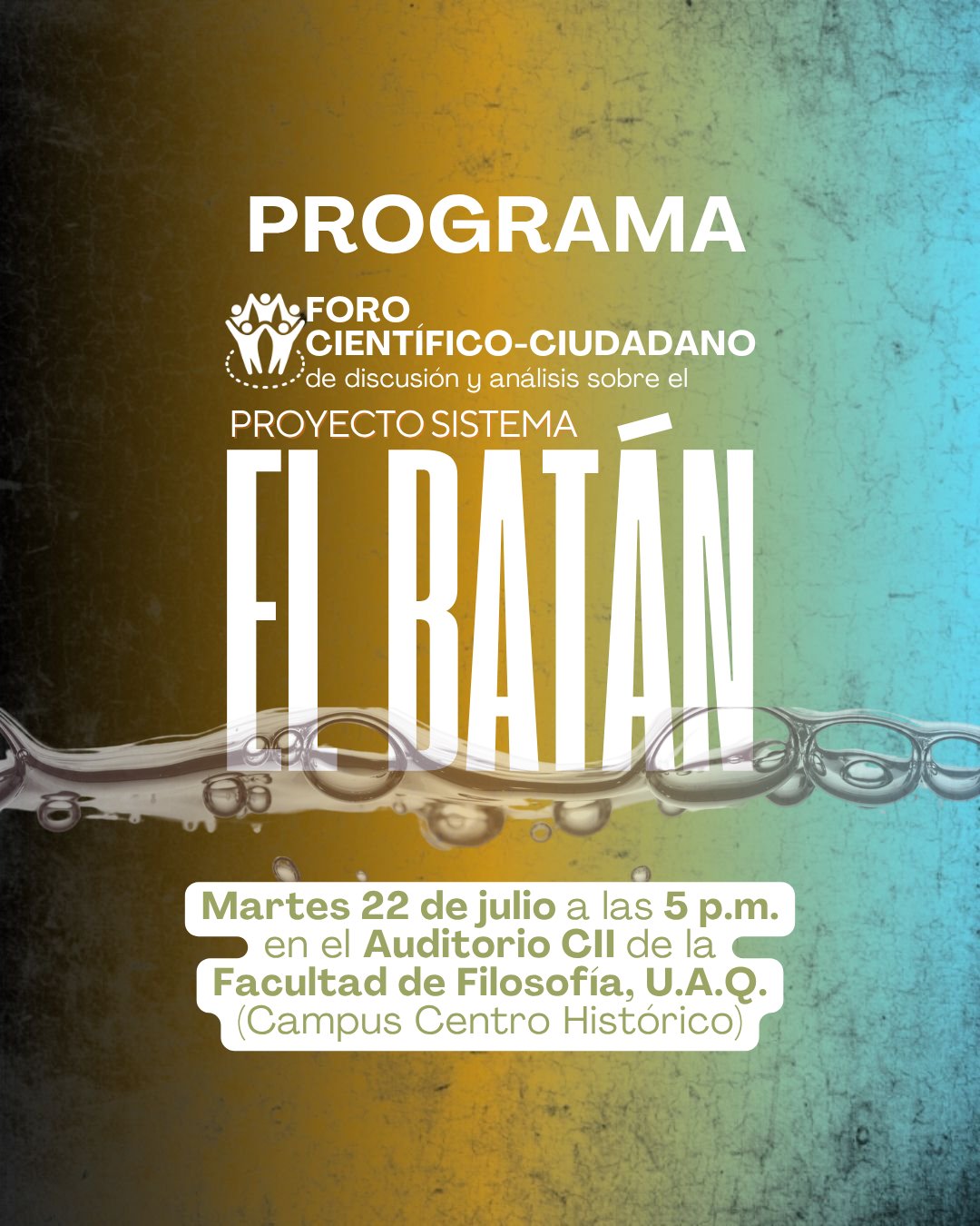 El martes 22 de julio de 2025 a las 5:00 p.m. se estará realizando el Foro Científico-Ciudadano de Discusión y Análisis sobre el proyecto El Batán en el Auditorio CII de la Facultad de Filosofía de la Universidad Autónoma de Querétaro, buscando abrir el diálogo para compartir inquietudes y propuestas.