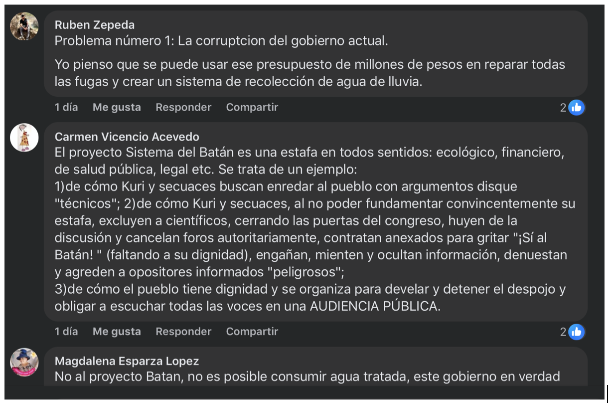 Usuarios en redes sociales han expresado su descontento con el proyecto El Batán a través del hashtag #NoAlBatan en X. Un tema recurrente en las publicaciones es la desconfianza que existe en la sociedad porque podrían abastecerse de agua tratada, aunque no se cierran a la idea de usarla para riego, usarla para consumo humano es un “no” rotundo.