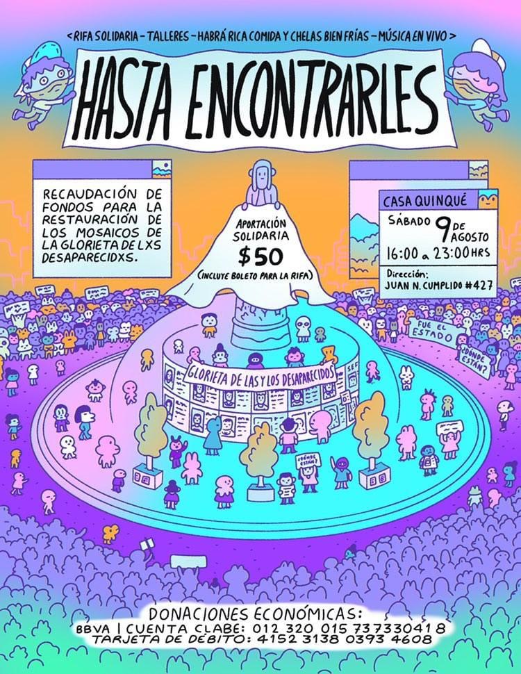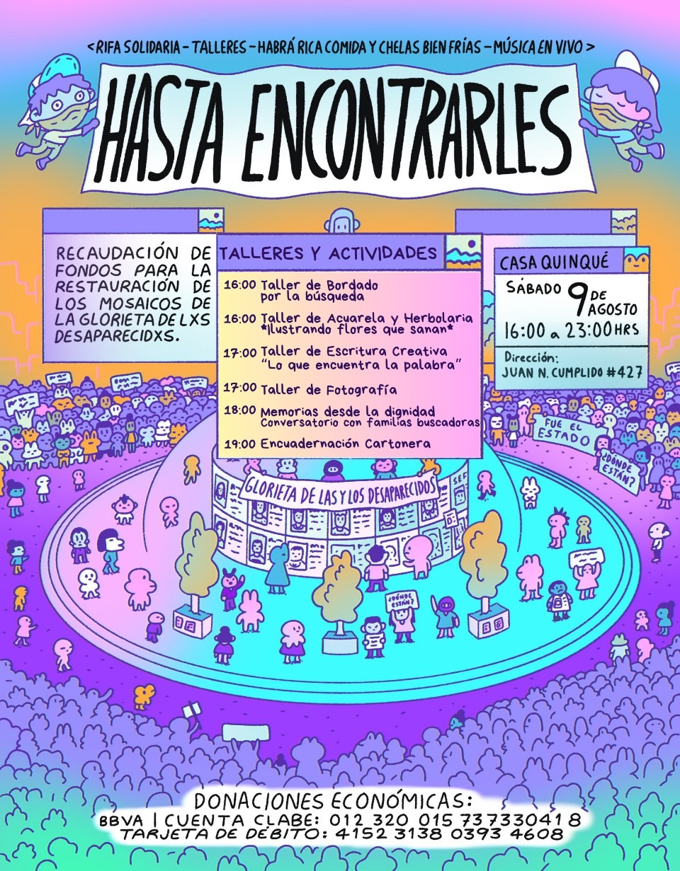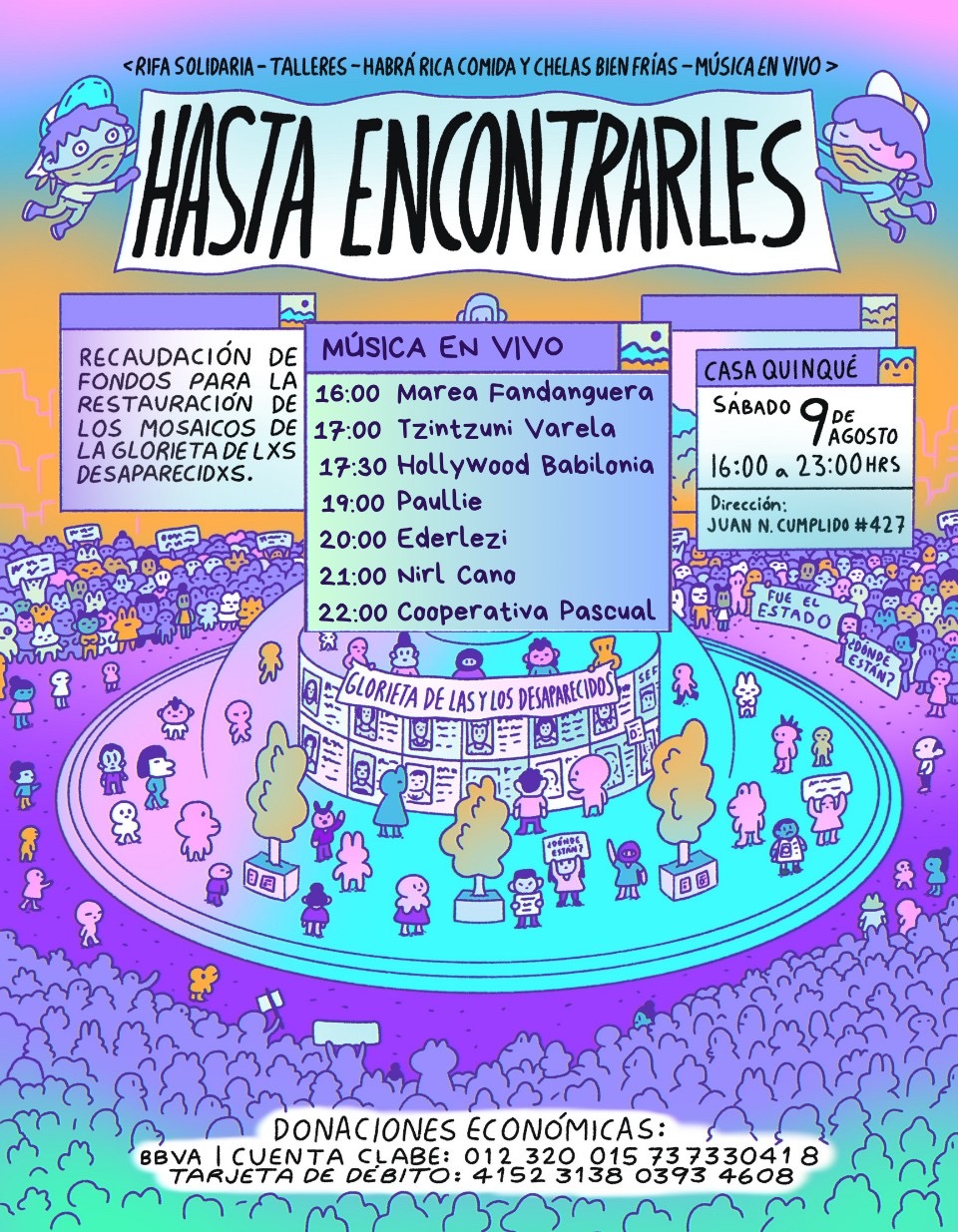 Como apoyo a las familias y colectivos buscadores, músicxs, artistas, talleristas y colectivos como la Red de Apoyo Contra La Desaparición Forzada se unieron para crear el evento solidario “Hasta Encontrarles”, en el que con música, talleres artísticos y creativos, además de “taquitos dorados y chelas bien frías”, buscan recaudar fondos para reparar y colocar las losetas de búsqueda ubicadas en la Glorieta de las y los Desaparecidos de Jalisco. La idea es que se consigan los recursos necesarios para seguir dignificando la memoria de las y los desaparecidos, así como la de sus familias que les buscan sin descanso.